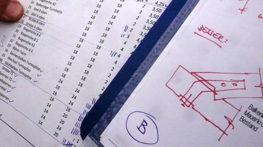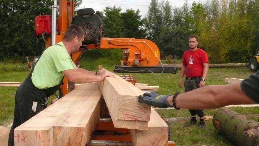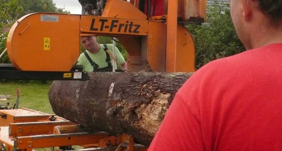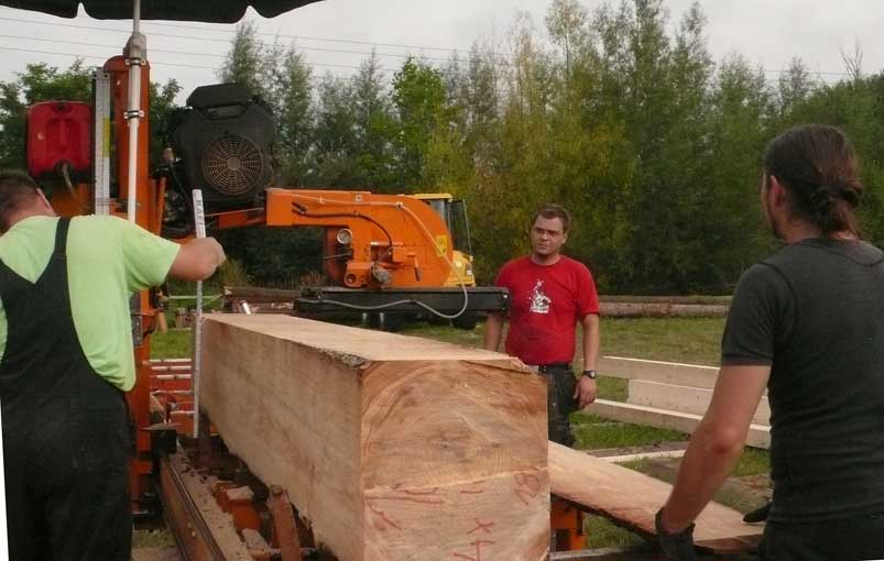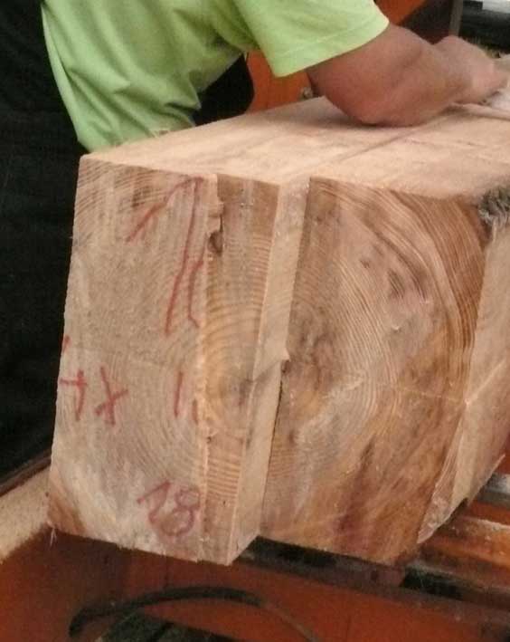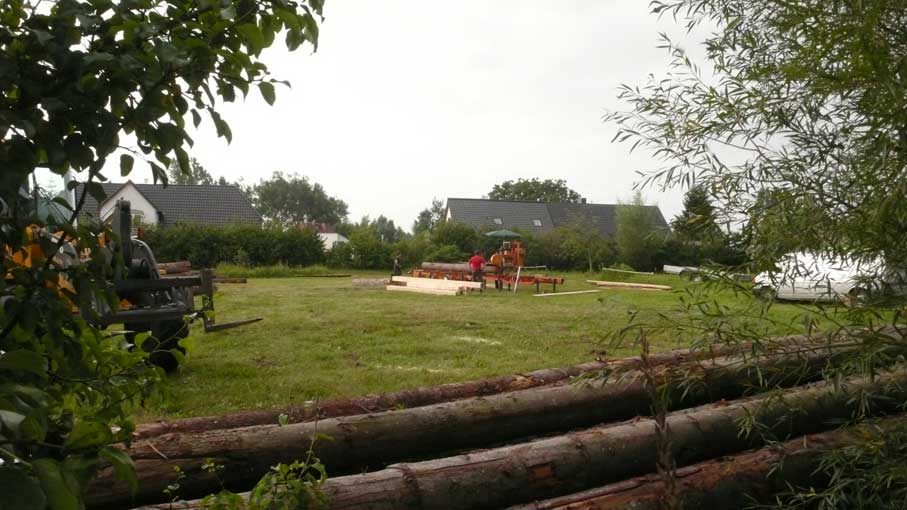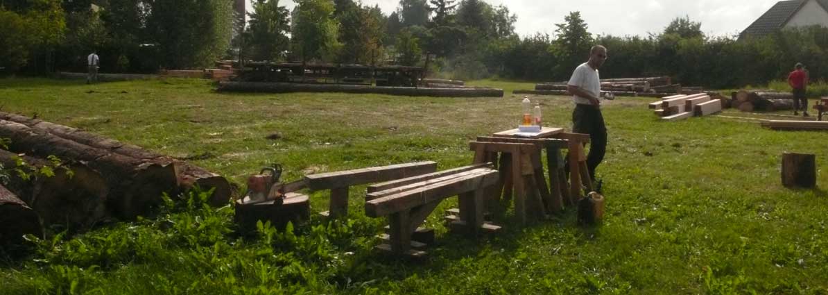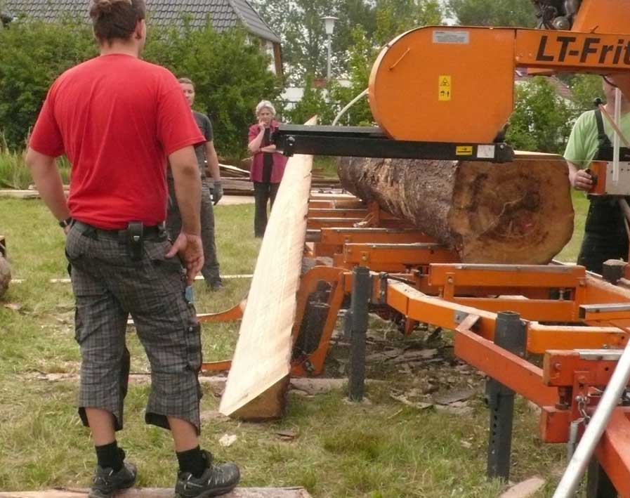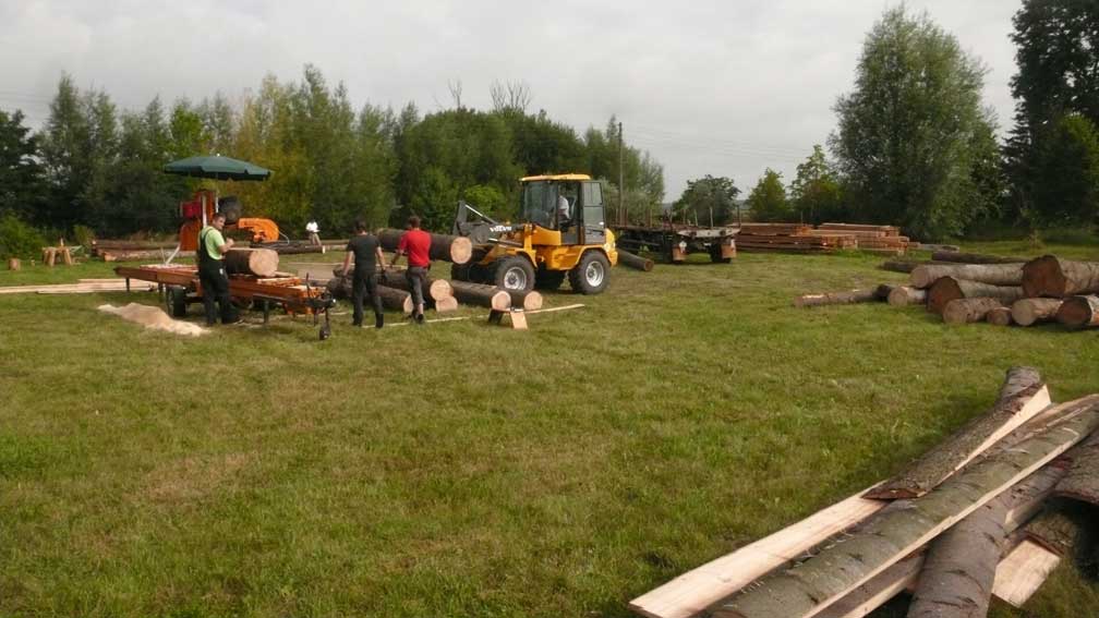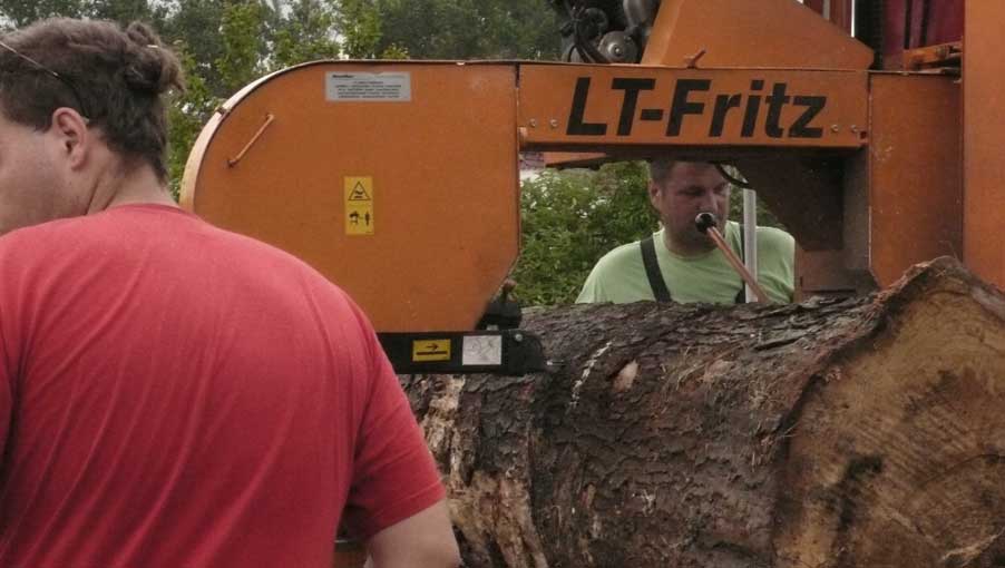wie aus dem Wald ein Turm wird. Wir wissen es. Aber sehen, tun, dabeisein ist was anderes.Wie aus den Stämmen Bretter, Balken werden, am Ort.