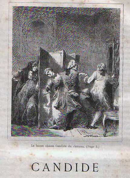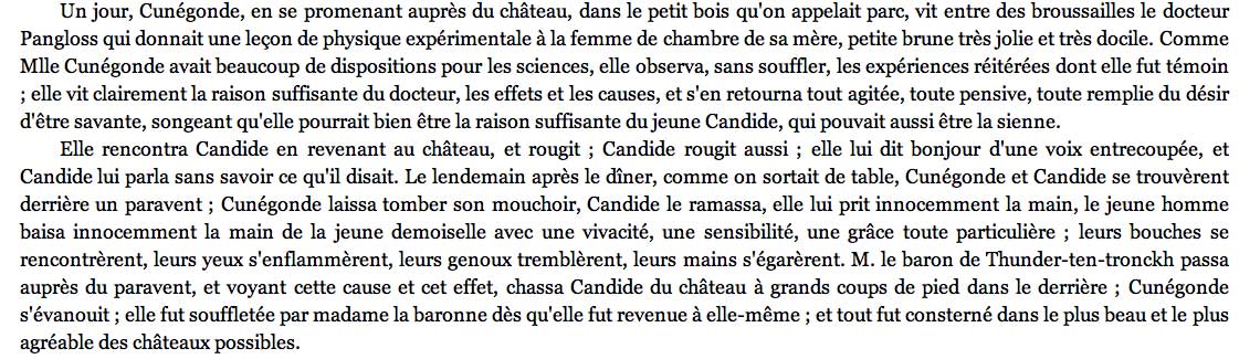 Pangloss disait quelquefois à Candide : “Tous les événements sont enchaînés dans le meilleur des mondes possibles ; car enfin si vous n’aviez pas été chassé d’un beau château à grands coups de pied dans le derrière pour l’amour de mademoiselle Cunégonde, si vous n’aviez pas été mis à l’Inquisition, si vous n’aviez pas couru l’Amérique à pied, si vous n’aviez pas donné un bon coup d’épée au baron, si vous n’aviez pas perdu tous vos moutons du bon pays d’Eldorado, vous ne mangeriez pas ici des cédrats confits et des pistaches.
