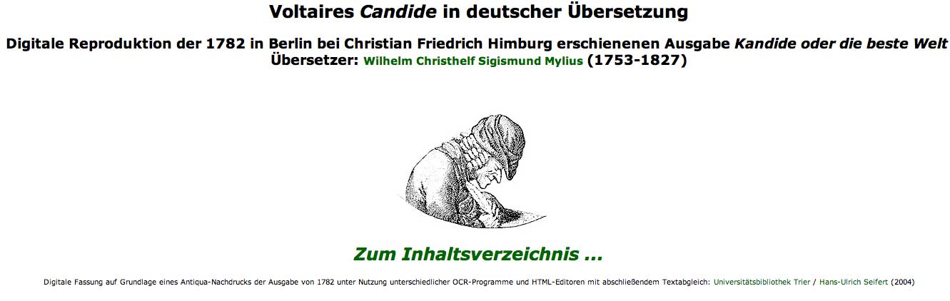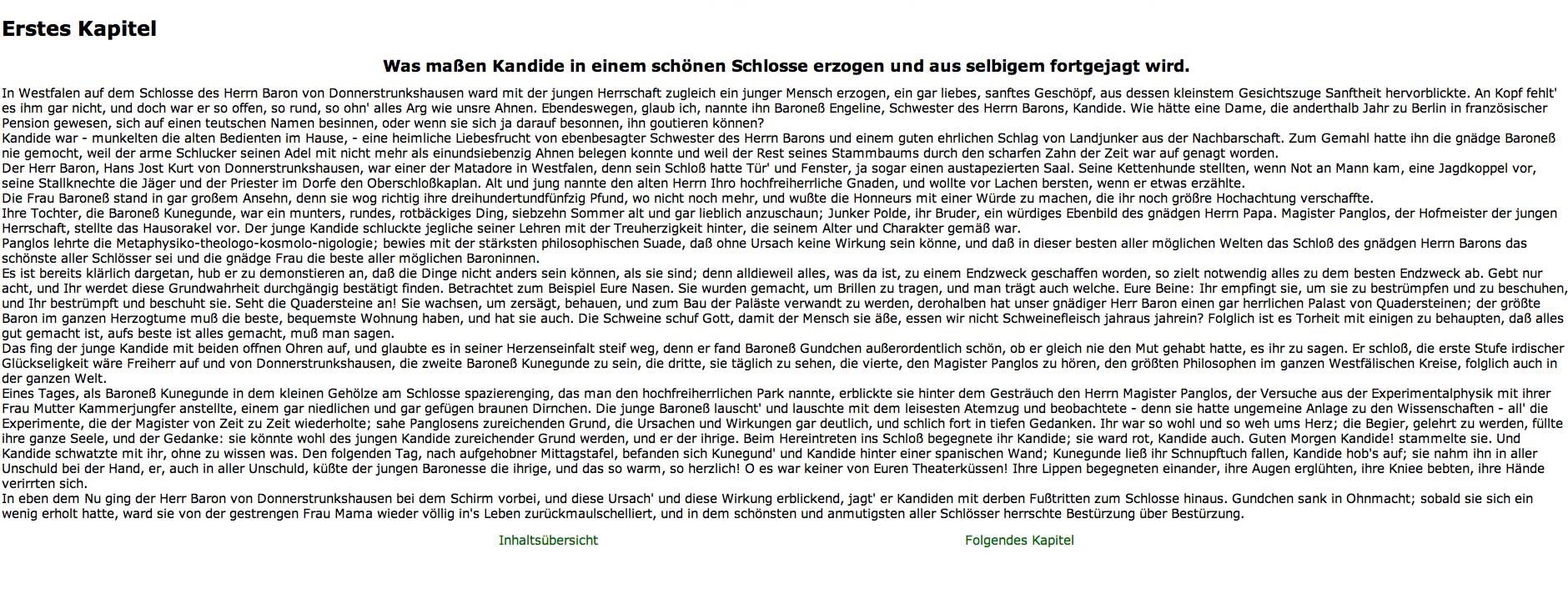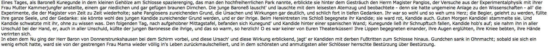 im Ersten Kapitel des Candide finden wir die Urszene wovon alles seinen Anfang nimmt. Das Paradies als Ur-Sprung der Welt und dessen Zerstörung schon in der An-Näherung mit dem Hinauswurf und der Suche nach ihr. Und wie alles gut wird am Ende, aber alles ganz anders. Sie ein Zerrbild früherer Schönheit, der Schändungen Folgen und zänkischer Natur, er den Garten bestellend als Kultivierung des Lebens.
