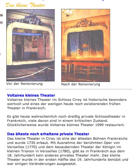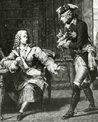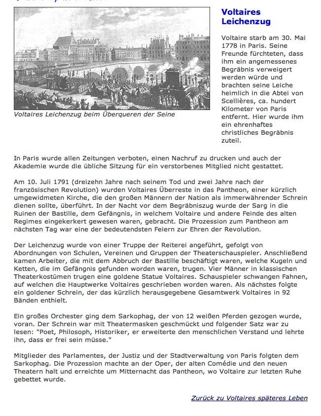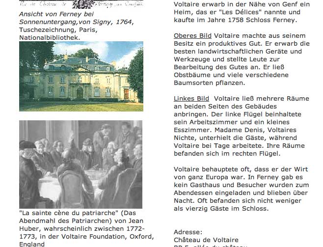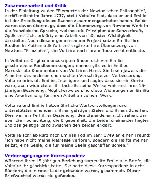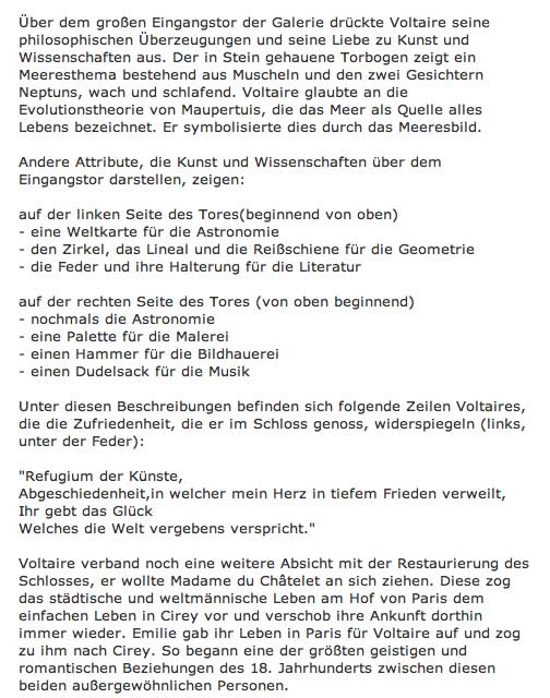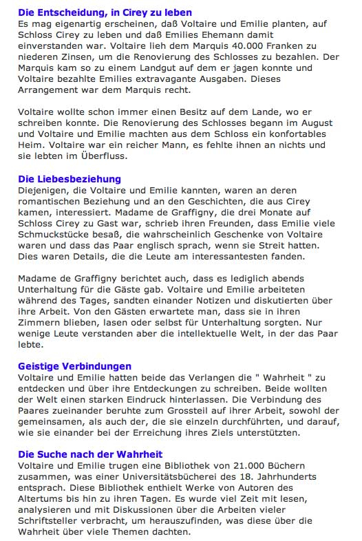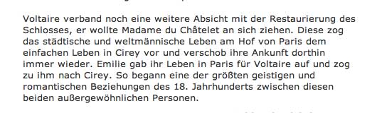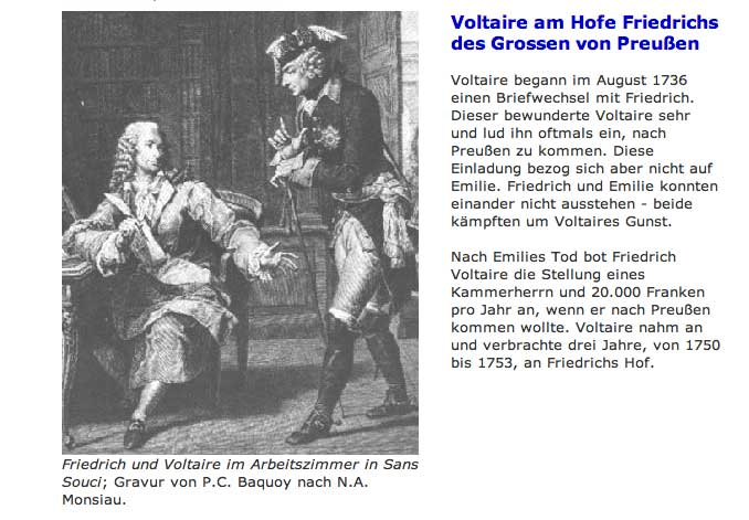 Viel wird jetzt zu Friedrich, den Grossen gemacht, und in diesem Zusammenhang auch zu Voltaire, mit dem er in einem heftigen Dialog verbunden war. De Geliebte aber des Voltaire bedarf eines beonderen Kapitels. Frau des anderen, Graf Chateletmit dem Schloss Cirey, in bedürftgen Zustand, zog und foh er -denn er war von den den Offiziellen verfolgt- hinaus mit ihr, und brauchte den Bau in Ordung mit seinen Mitteln, finanzell und nach seinen Prinzipien, zum Beispiel das Eingangstor mit seinen gedanklichen Allegorrien versehen. Die Einladung aus Preussen kam dort hinein und zog ihn an als einer an den Hof Salomo des Nordens und stiess auf ihr Misstrauen. So sehr, dass erst ihr früher Tod ihn für dieses Abenteuer fähig werden liess. Als eines durch diesen Verlust menschlich reifen Mannes.