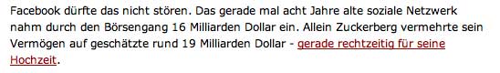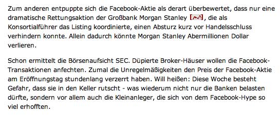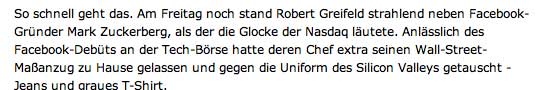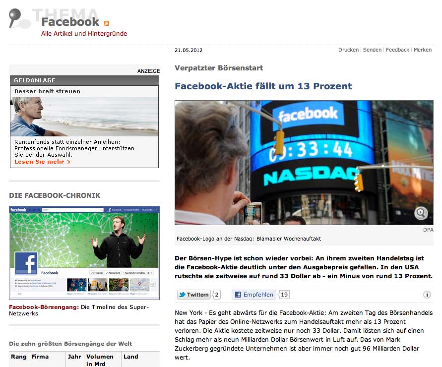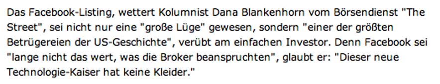 Facebook-Aktie fällt tief: Ausverkauf am zweiten Handelstag New York (dpa) - Nach zwei Tagen an der Börse sieht die Bilanz für Facebook ernüchternd aus: Die Aktie brach in New York um 11 Prozent auf 34 Dollar ein. Sie notiert damit vier Dollar unter dem Ausgabekurs. Der Gesamtwert des Sozialen Netzwerks schmolz von anfangs 104 Milliarden auf rund 93 Milliarden Dollar zusammen. Nachbörslich ging es weiter runter. «Die platzierenden Banken haben es völlig vergeigt», sagte Analyst Michael Pachter dem dem «Wall Street Journal», der schon Marc Zuckerbergs legeres auftreten vor Investoren in Kapuzenpulli und Jeans kritisiert hatte.
