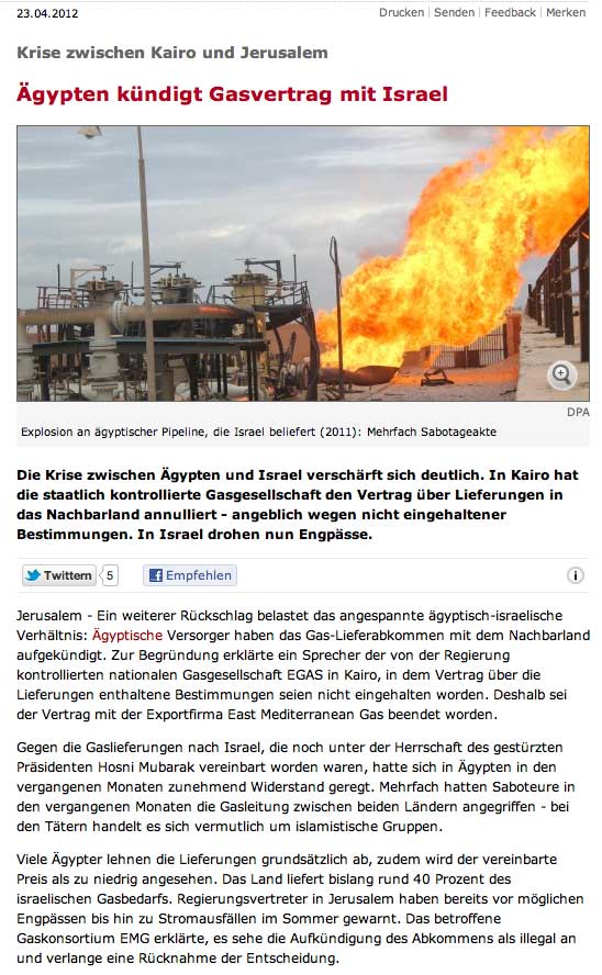 Kairo (dpa) - Ägypten hat seine Gaslieferungen an Israel eingestellt. Der Vertrag mit der East Mediterranean Gas Company sei beendet worden, weil vertragliche Vereinbarungen nicht eingehalten worden seien. Das teilte die nationale Gasgesellschaft mit. Aus dem ägyptischen Ölministerium verlautete indes, die Lieferungen seien auch wegen der häufigen Anschläge auf die Pipeline auf der Sinai-Halbinsel eingestellt worden. Israel und Ägypten hatten 2008 ein für 15 Jahre gültiges Abkommen über die Gaslieferungen geschlossen. Das sind 40% des Gasverbrauchs in Israel.