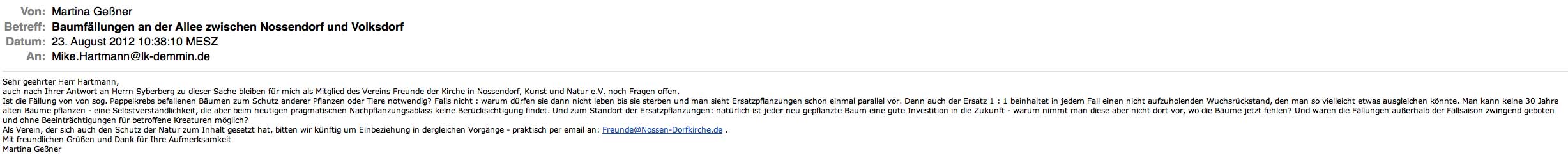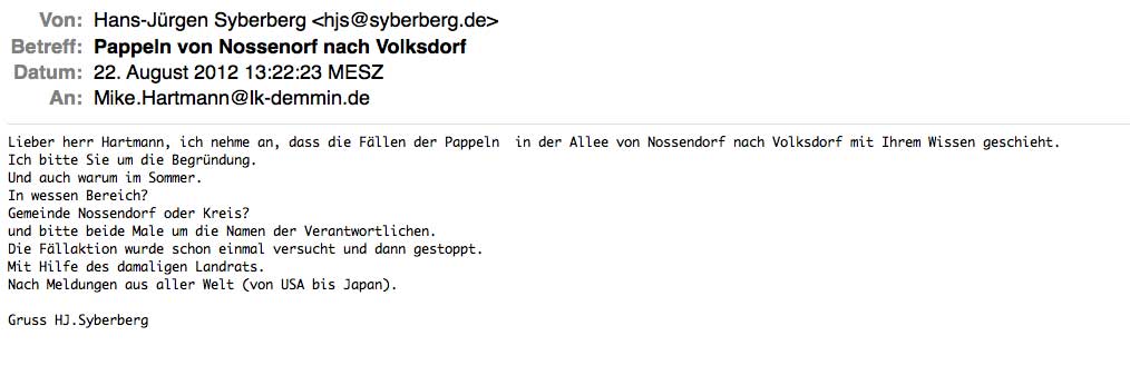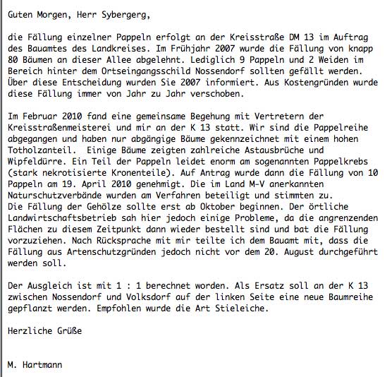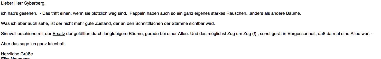 Ersatzpflanzungen für die gefällten 100 Pappeln von 2007 sind nicht an-gemessen erkennbar und laut Baumschule durch mangelbnde Pflege(kein Wasser) nutzlos.