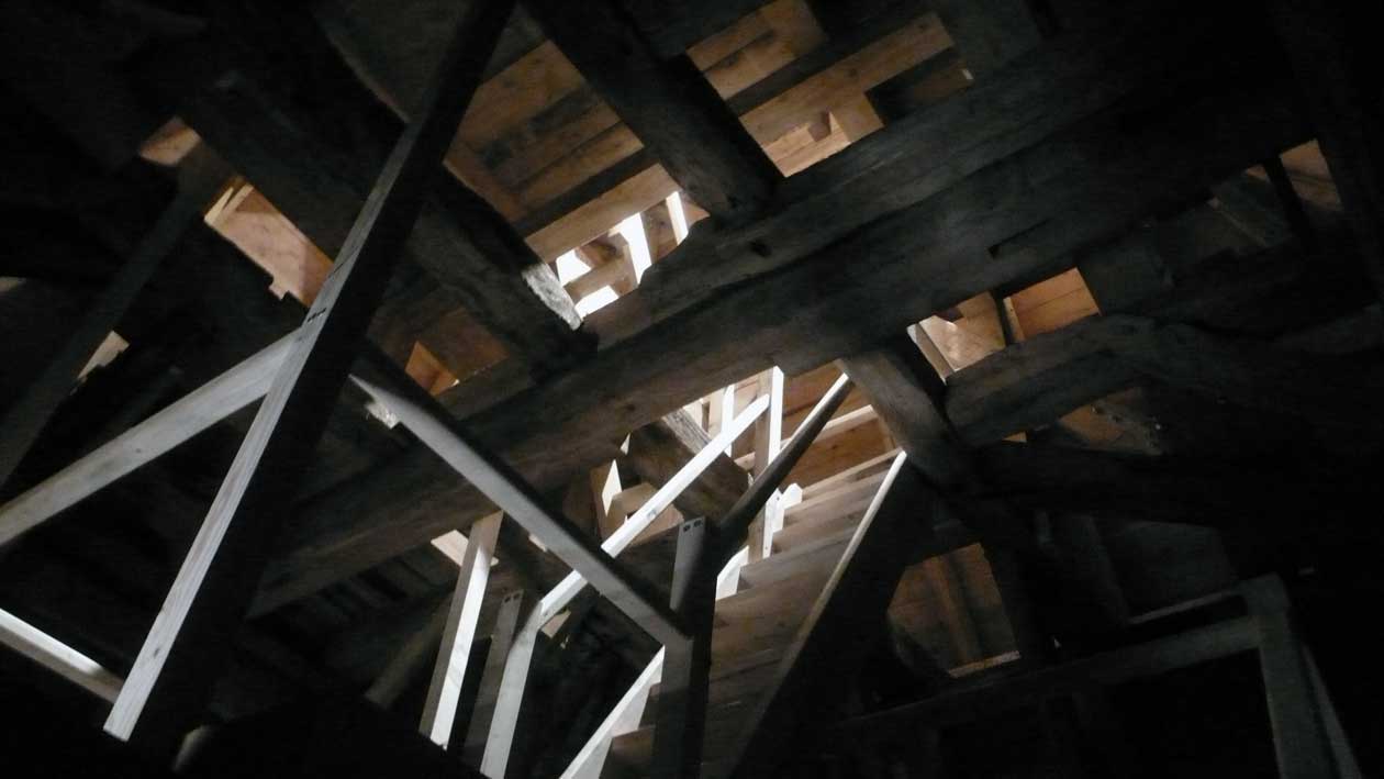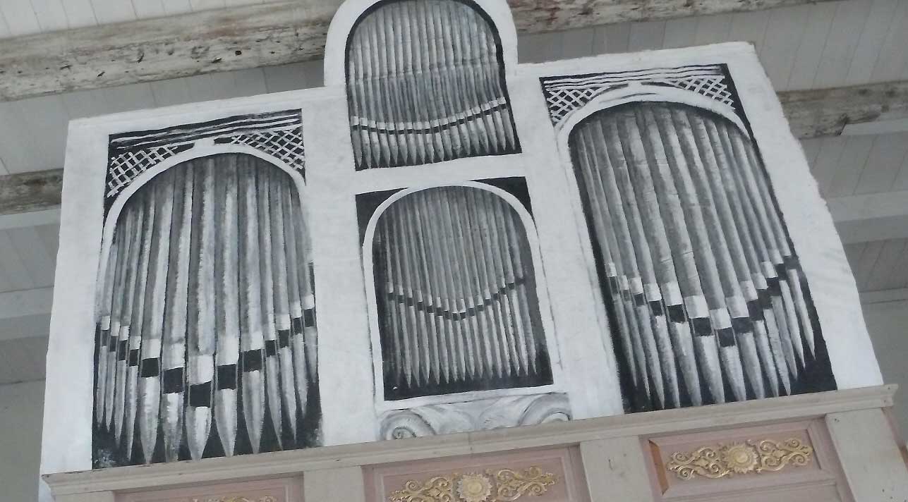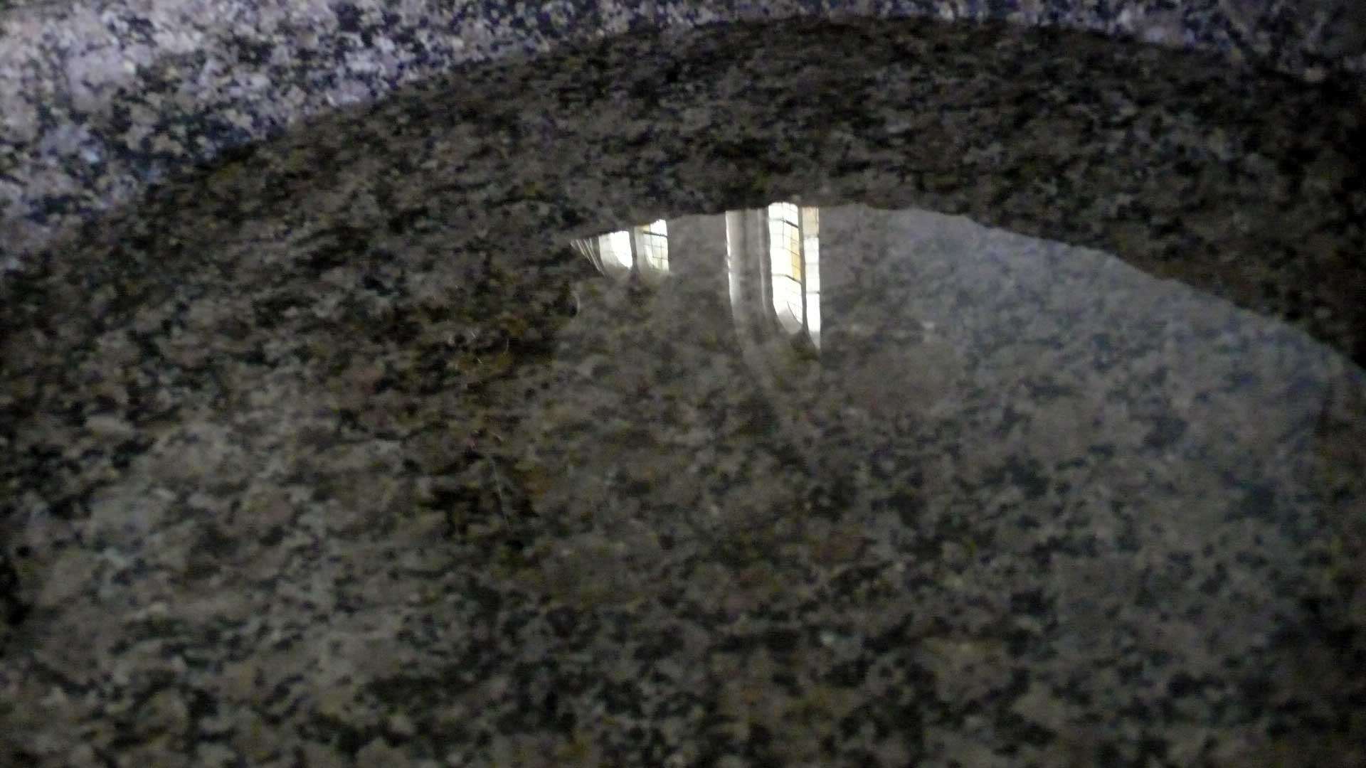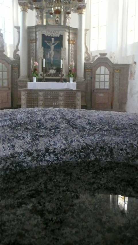 Wasser wieder im 800jährigen Stein vor dem Altar der Kanzel oben . Mit der Orgel gegenüber als Vision.