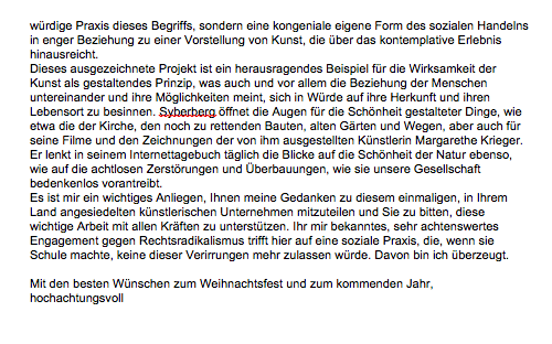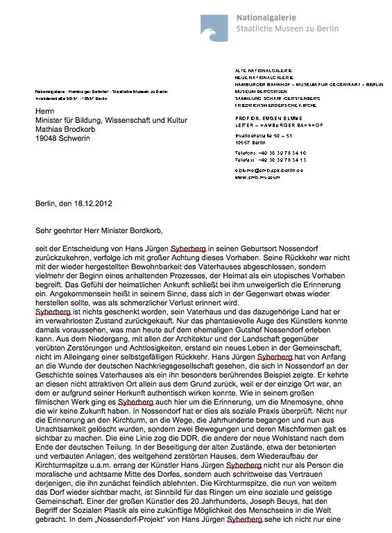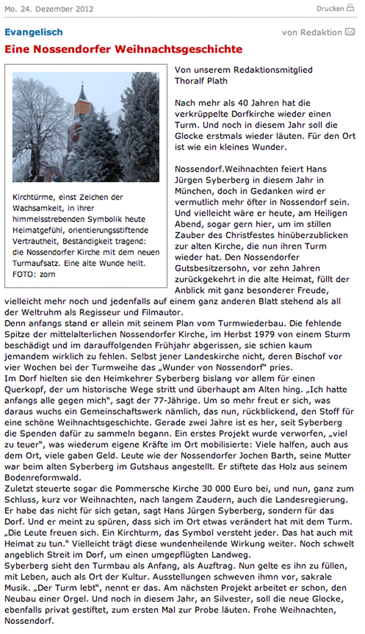 Als ich 1989 kam, 42 Jahre danach, war alles verloren, wurde es Ein Traum, was sonst, als ich 10 Jahre später wiederkam, wollte ich es installieren als Verlust. Mit einer Kammer zur Regie des Nichts. Heute hören wir die Trompete aus dem neuen Turm und die Menschen sagen ja dazu. Schon warten sie auf die neue Glocke alltäglich und den Orgelklang im warmen Raum>>>>