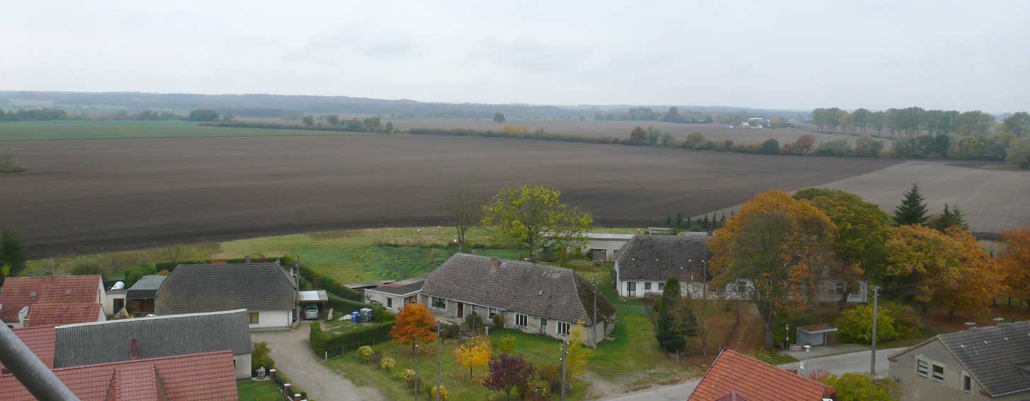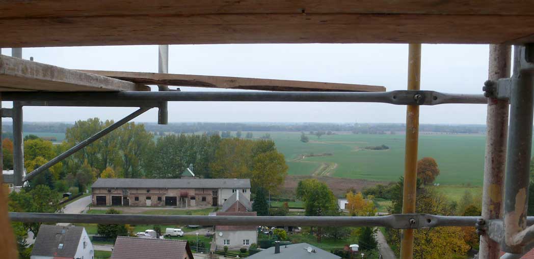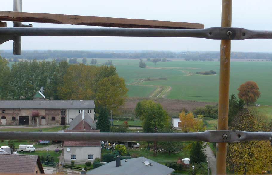 Die Blicke aus dem Turmhelm über das geschundene Dorf in das geschändete Land