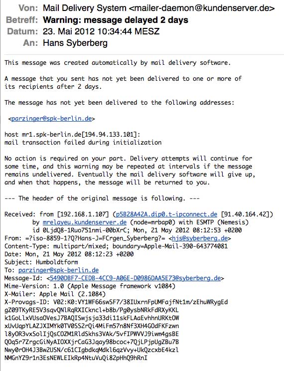 Mails an den Präsidenten der Stiftung preussischer Kulturbesitz in Sachen Humboldtforum aus NY kamen alle zurück. Der perfide Trick ist: zurück kommen sie in veränderterter Adresse, vorgebend als habe der Absender einen Fehler gemacht.