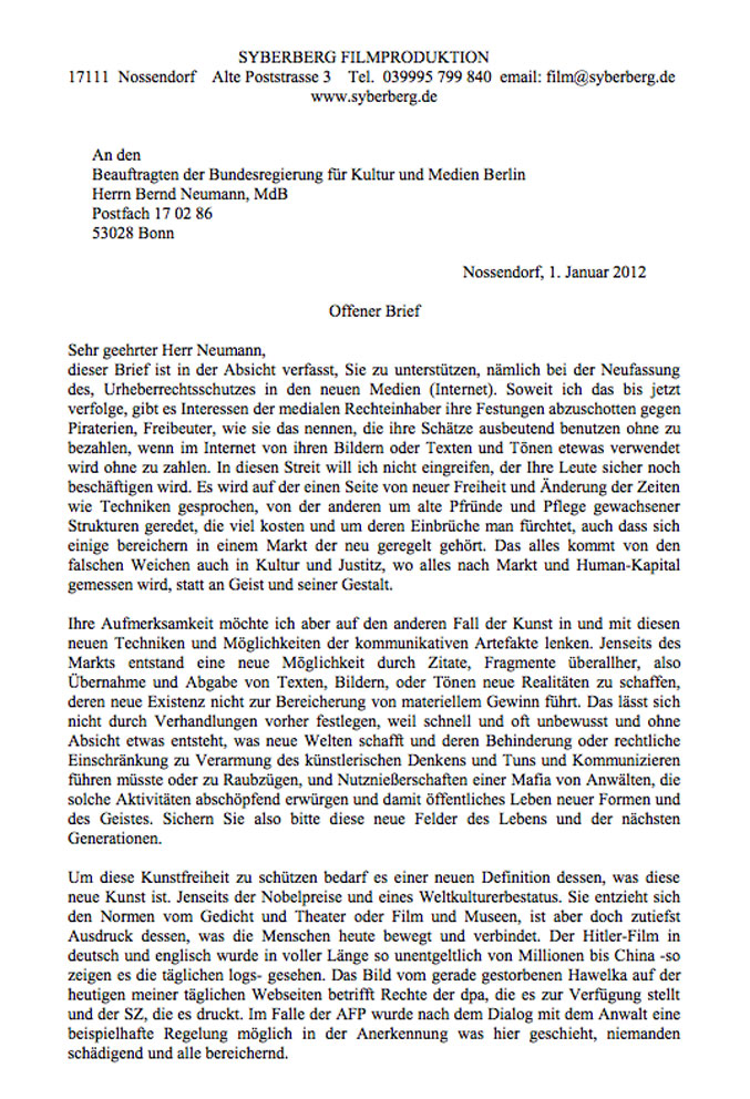 Zweimal haben berufsmässige Haie aus der Webbranche versucht diese Seiten zu zerstören, indem sie sich Presseargenturen anboten finanzielle Forderungen wegen der täglichen Zitatezum Weltgeschehen zu stellen und diese bis in die Gerichte brachten. Beidemal waren erhebliche auch juristische Aufwendungen nötig darzustellen um was es hier geht. Als Artefakt und nicht kommerzieller Art . Beidemal mit Erfolg. Abgewehrt wurde diese Angriffe, weil sonst alles aus über 10 Jahren Arbeit und in Zukunft zusammenbräche, was hier mit täglichen Mühen geschieht. Wir wandten uns an die Chefetagen der Argenturen selbst und an den zuständigen Minister für Kultur und Medien in Berlin in einem offenen Brief wegen der anstehenden Novellierung des Urhebergesetzes.
