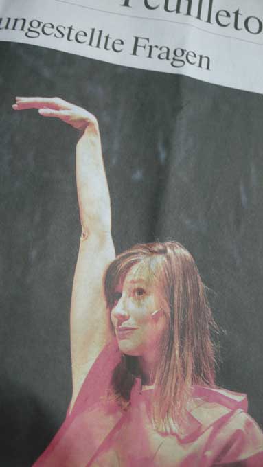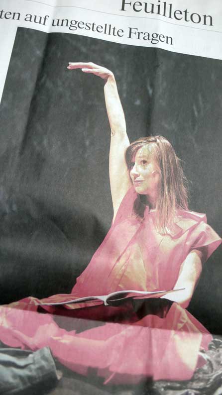 gerühmt werden die gute Kondition des "vertretbaren Aufführungsmasses" und die "bewunderungswürdige Textsicherheit". Man sehe das Gewächs in dem Gesicht des Monologs auf dem Boden der Bühne sitzend, sie hat keine Chance... das verheisst nichts Gutes. Bald wird die Callas der Zukunft mit Mikro-Phonen verstärkt werden, um sie vor den Zumutungen der grossen Räume unserer Theater und solcher Täter um sich zu schützen.