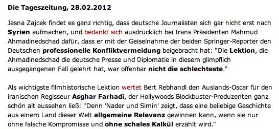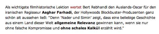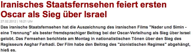 Das iranische Staatsfernsehen hat die Auszeichnung des iranischen Films "Nader und Simin - eine Trennung" als bester fremdsprachiger Beitrag bei der Oscar-Verleihung als Sieg über Israel gelobt. Das Fernsehen berichtete am Montag in nationalistischen Tönen über den Sieg des Regisseurs Asghar Farhadi. Der Film habe den Beitrag des "zionistischen Regimes" abgehängt, hieß es.