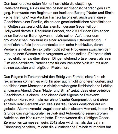 Trost für Wim Wenders und sein Team sein: Der siegreiche Konkurrent „Undefeated“ wird lediglich das Material für eine Weinstein-Produktion liefern, „Pina“ wird in die Filmgeschichte eingehen. Endgültiger Beweis der Macht – die wichtigsten Oscars für Film, Regisseur und Hauptdarsteller des Jahres gingen an Weinsteins „The Artist“.