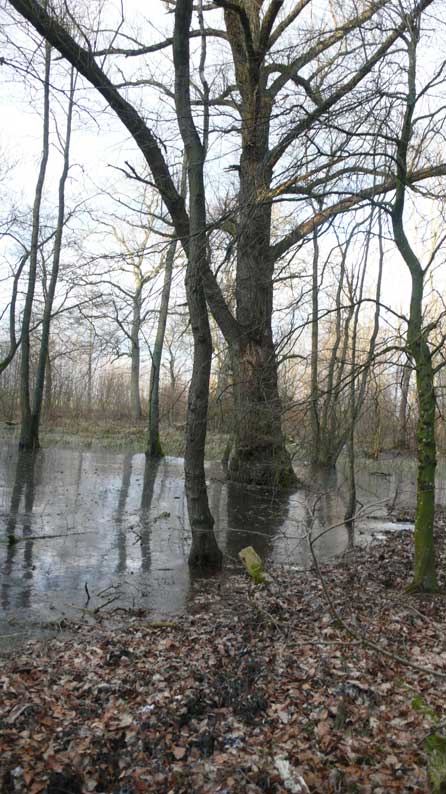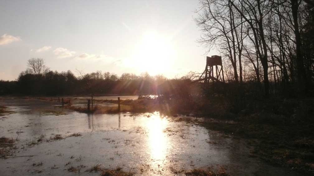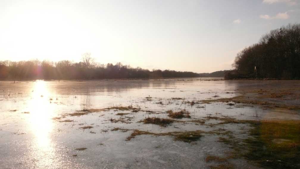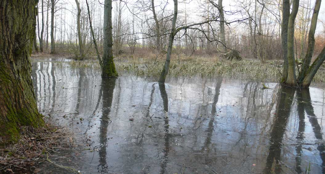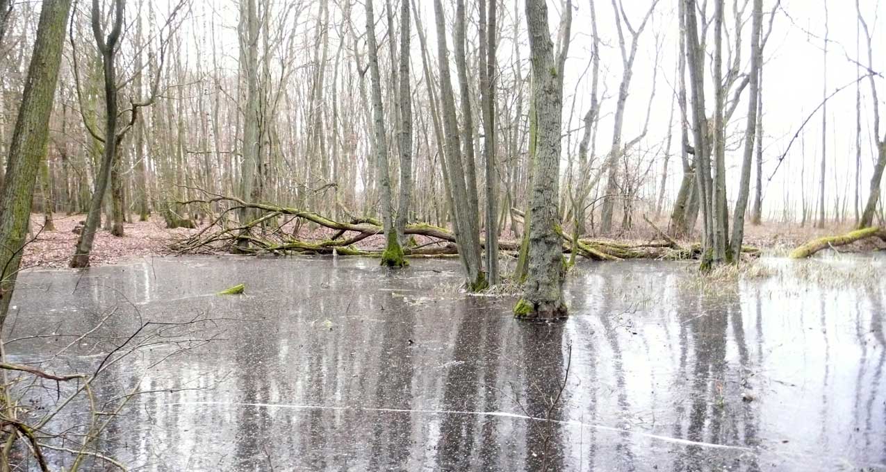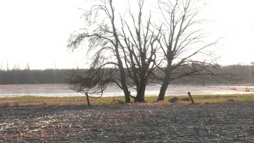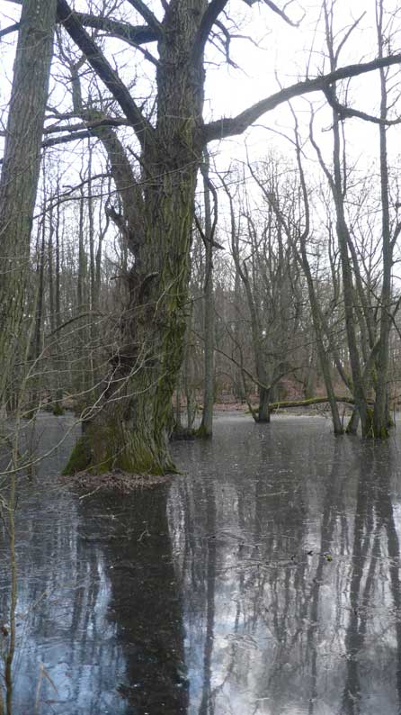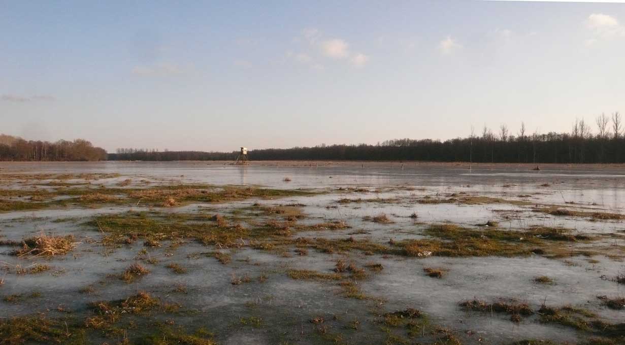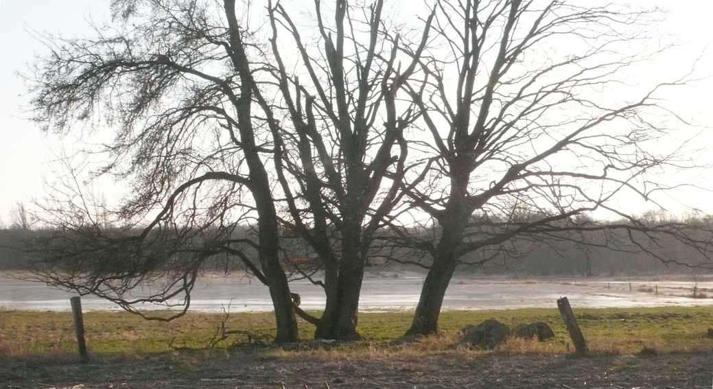 Auf dem Weg dorthin die im Winter überschwemmten Wiesen, wie zu der Kinder Zeiten. Nur ohne Kinder heute. Wo sind sie geblieben.