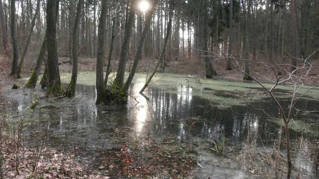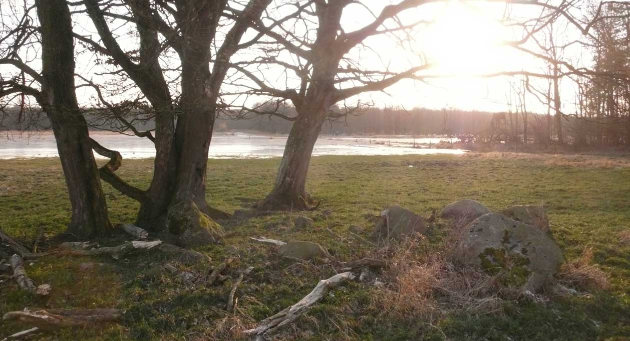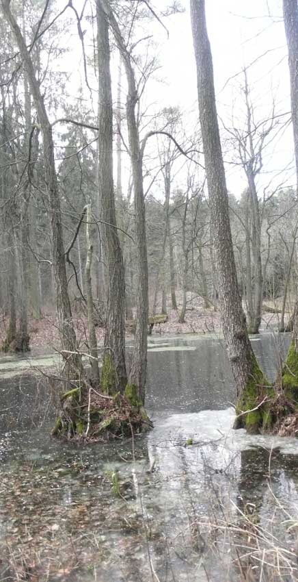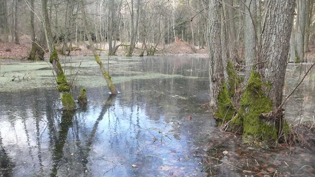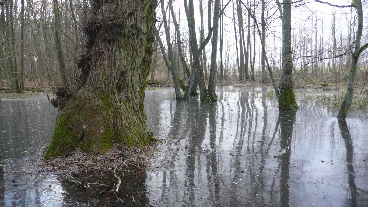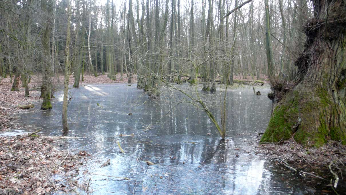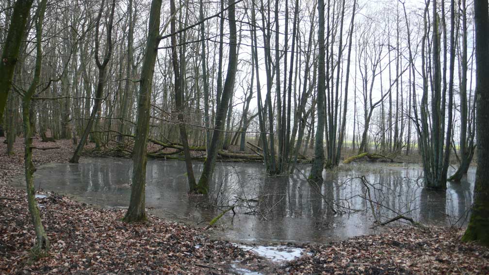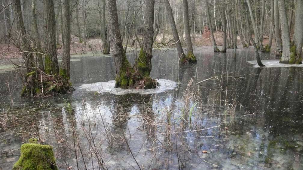 Auf dem Weg dorthin die im Winter überschwemmten Wiesen, wie zu der Kinder Zeiten. Nur ohne Kinder heute. Wo sind sie geblieben.