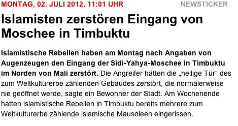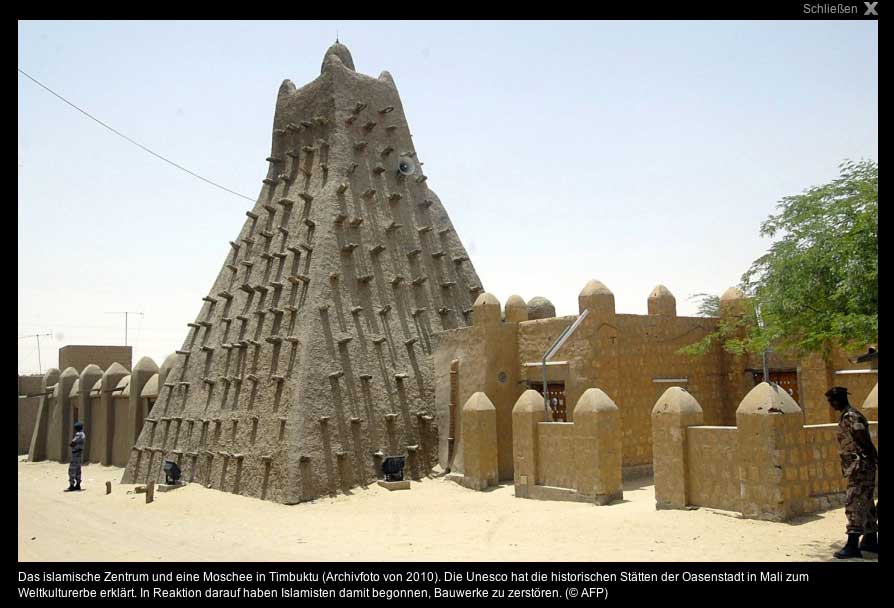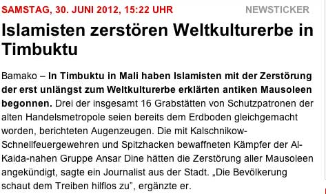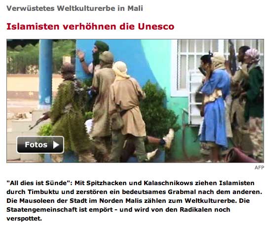 "All dies ist Sünde": Mit Spitzhacken und Kalaschnikows ziehen Islamisten durch Timbuktu und zerstören ein bedeutsames Grabmal nach dem anderen. Die Mausoleen der Stadt im Norden Malis zählen zum Weltkulturerbe. Die Staatengemeinschaft ist empört - und wird von den Radikalen noch verspottet.