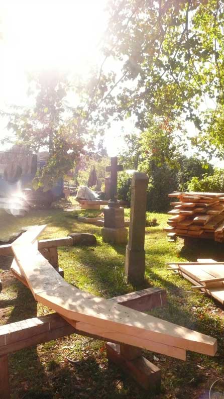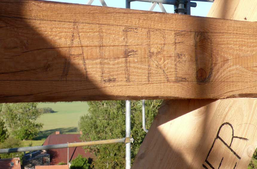 4 mussten es sein, bis das Richtige gefunden war. Nun in den Zimmern verteilt. Der Tisch des Kinderzummers aus dem Holz der Ställe. Die Grenzpfähle alle von ihm und so der Tempel hinten gegen über der Kirche nun mit Turm vorne. Über den Hof.