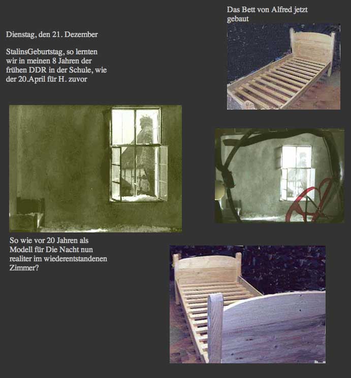 Kein Fenster ohne ihn, die Treppe, abgebrannt, von ihm mit gerettet in alter Gestalt, von ihm die Betten aus Holz nach dem Modell aus der NACHT