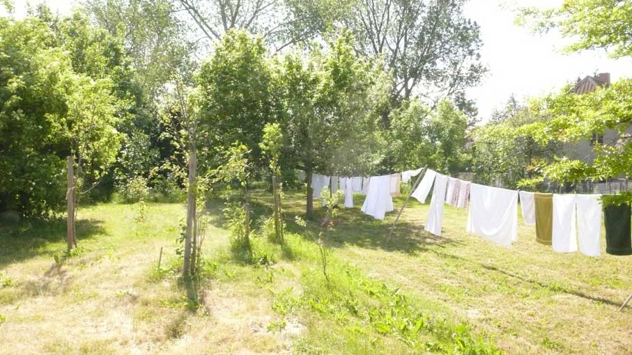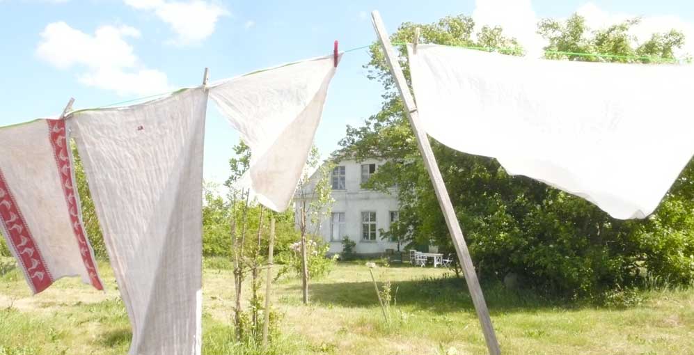 frisch gewaschene Wäsche im Wind vor dem Haus, die Fahnen des Lebens, zeigt dass hier noch oder wieder Leben ist.