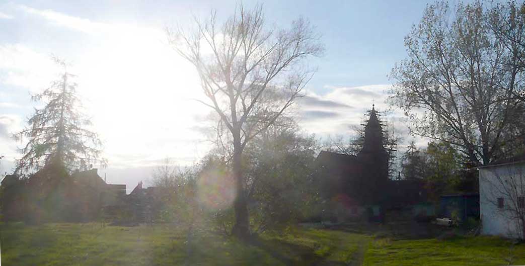 Der Turm ist das Mass auch für die Höhe der Ställe und Scheunen der Tiere und der Bescheidenheit der Menschen-Häuser wieder. Auch ohne Tiere und Land nun für das was blieb.