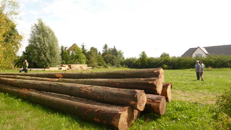 und wo das Holzgestapelt zur Beabeitung im Abbund des Fachwerks