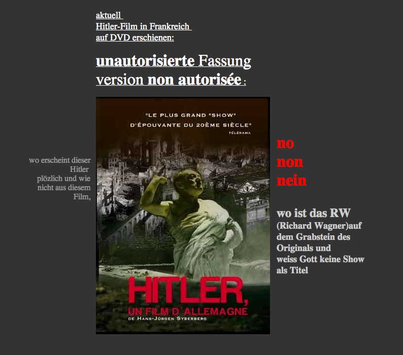 In Paris und Frankreich jetzt erlaubt sich einer den Hitler-Film ohne RW zu präsentieren. Das ist eine Fälschung. ein Fake würde man im Englischen sagen und das ist nicht erlaubt. Bayreuth wird sich freuen, aber ist es noch das des RW?