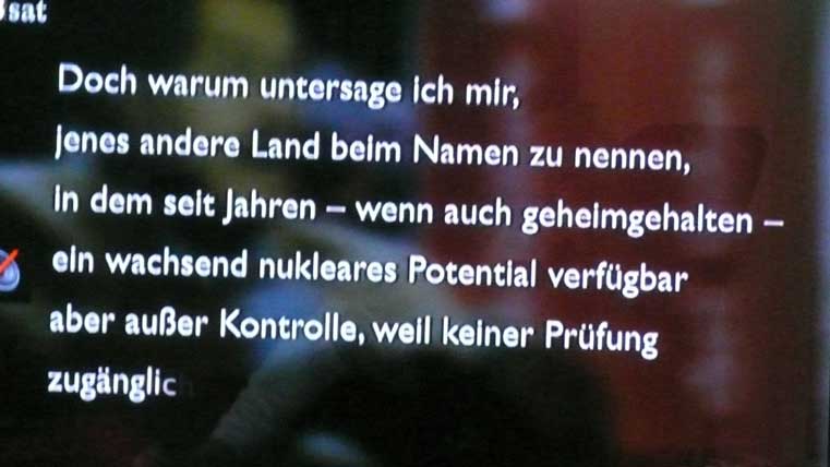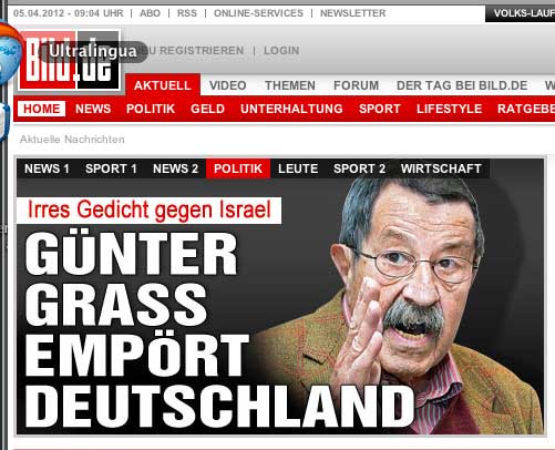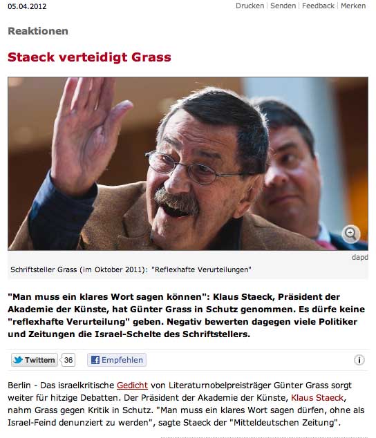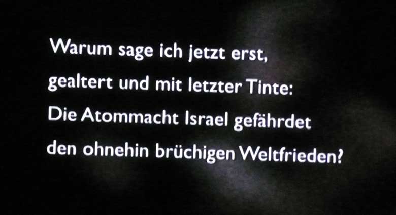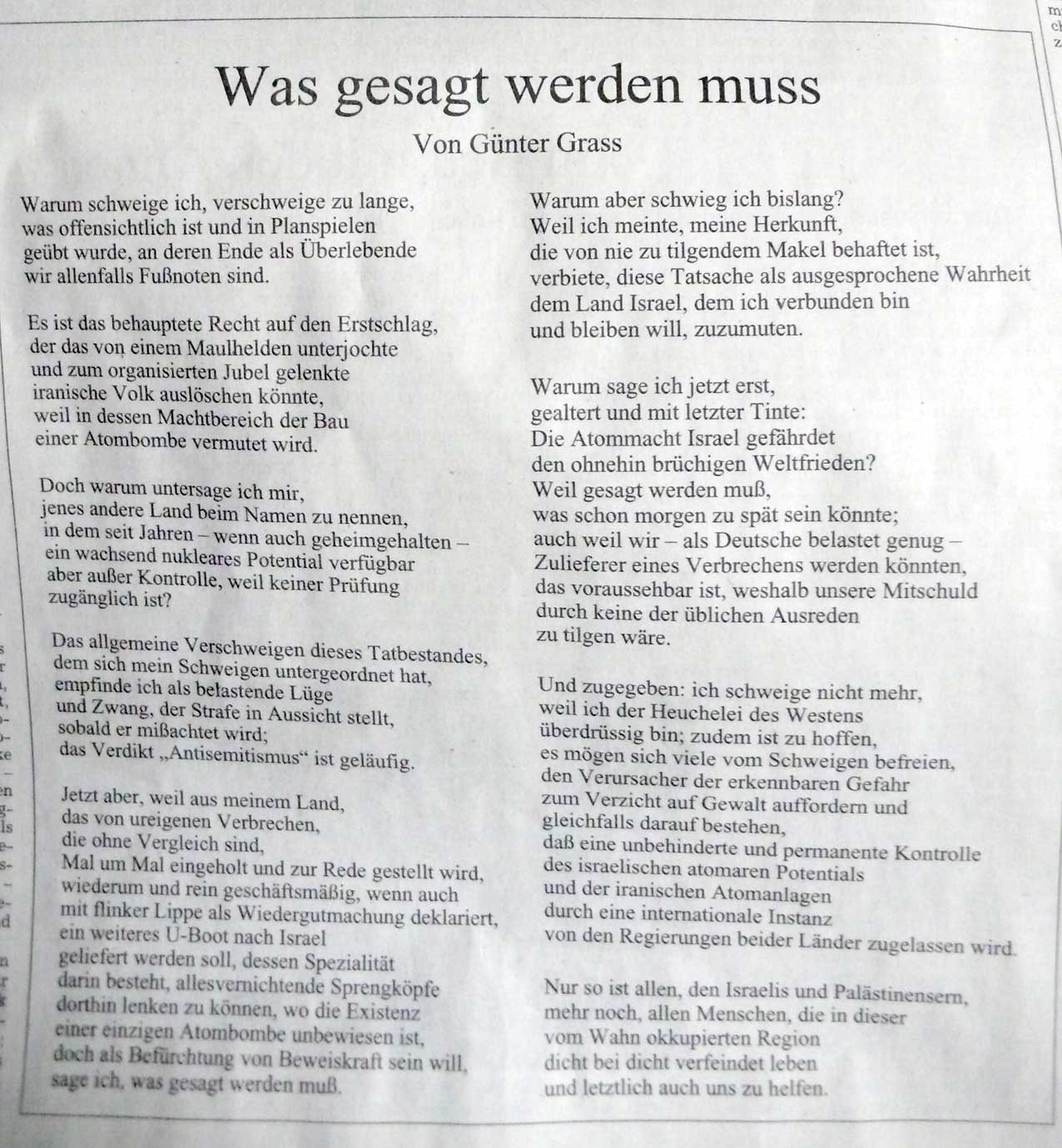 Was Grass hier schreibt, kann man in Teilen jeden Tag als Warnung überall hören, lesen. Warum der Auffruhr also: Der ehemalige Chef des Mossad warnt seine Regierung dringend, der FBI warnt und die USA, die Friedensfreunde(Uri Avnery und seiner Freunde)in Israel beschwören ihr Land. Hier aber hat einer und gerade in Deutschland, wo sonst, alles zusammengefasst in Worte ausserhalb der Prosa, in eine Form gestellt, die einen anderen Anspruch erhebt. Erste Worte im Radio kamen alle 10 Minuten, er wolle sich ein Denkmal setzen, als Vorwurf -seltsam, das hiesse dass man ihn also begrüsse und in ihre Mitte stellen allgemeine Resonnanz voraussetzt und beängstigt, oder sie rufen die Regierung auf, sie müsse eingreifen, eingreifen, Polizei, Gefängnis? Sie sprechen von Eitelkeit, nach soviel Beschimpfungen? Die Hüter des Konsens ihrer Geschäfte müssen toben und dafür sorgen, dass alles läuft.