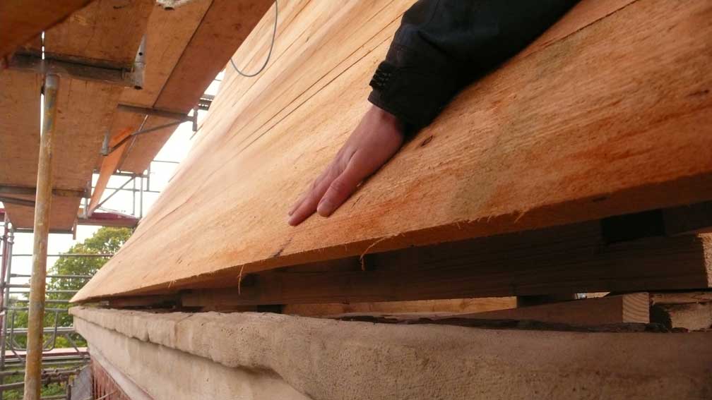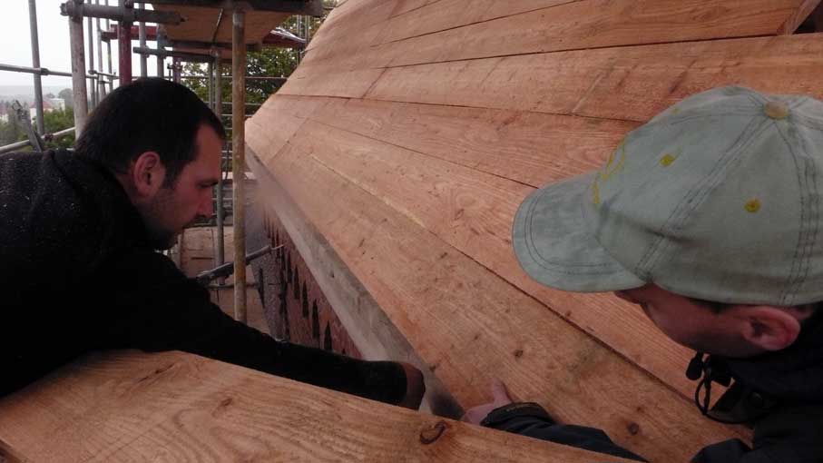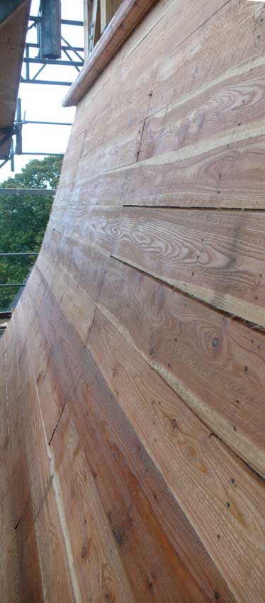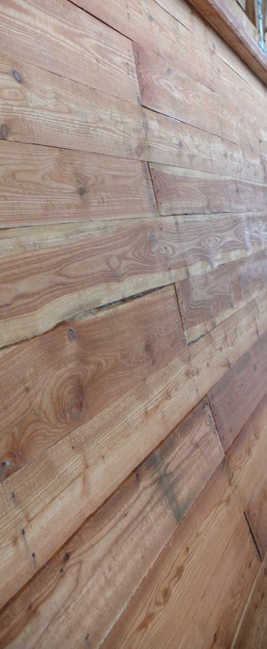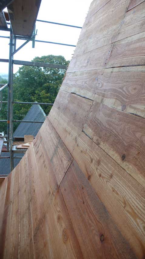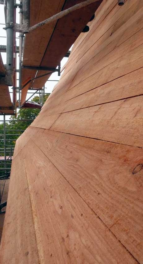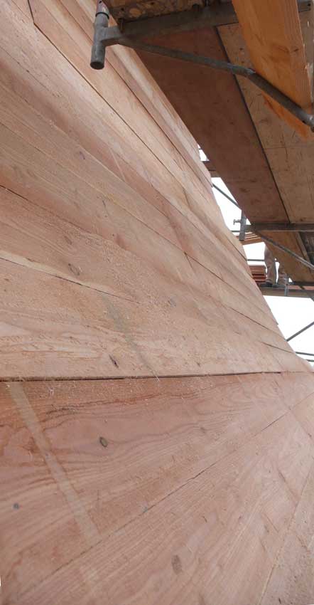 die Verschalung des Turm-Daches gleicht der inneren Haut, die ihn schützt. Unten und Oben. Bis unter die Spitze.