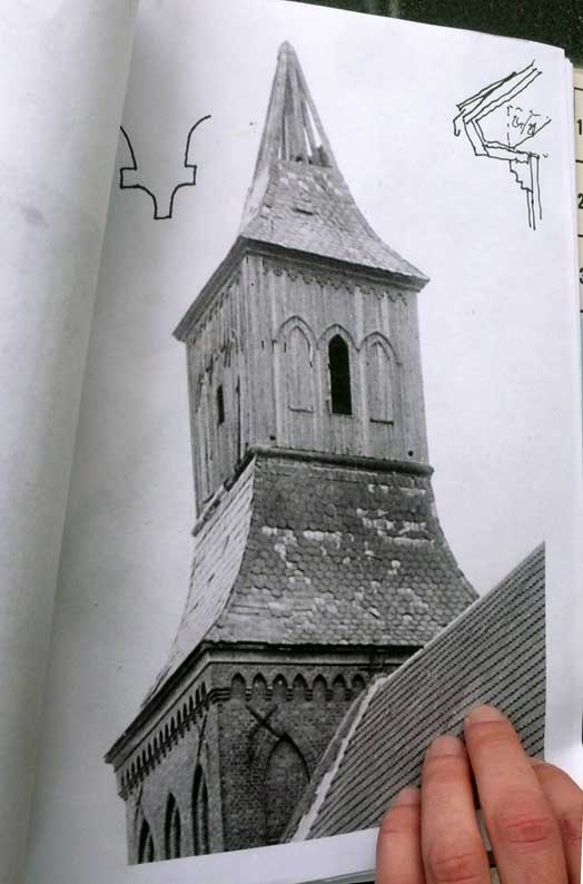 Die Fragen ob Holz oder Blech oder Schiefer diese wichtige Kante und Linie des Turms bestimmen wird, ist eine, die nicht missen möchte, wer dabei ist. Zusammen muss entschieden werden.