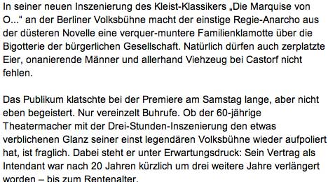 Eigentlich könnte Volksbühnenchef Frank Castorf in seiner Kleist-Premiere „Die Marquise von O...“ befreit aufspielen lassen. Seinen Vertrag hat er bis 2016 verlängert, drei Produktionen vom RosaLuxemburg-Platz sind zum Berliner Theatertreffen eingeladen. Und angesichts der vielversprechenden Besetzung – zu altbewährten Volksbühnenkräften à la Angerer, Hendrik Arnst, Jeanette Spassova oder Frank Büttner gesellen sich die Ausnahmeakteure Ilse Ritter und Sylvester Groth – konnte theoretisch gar nichts schiefgehen.