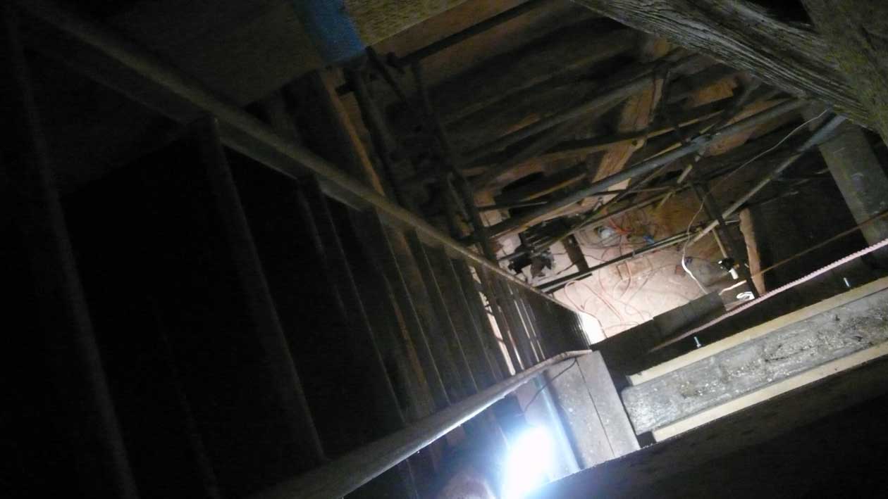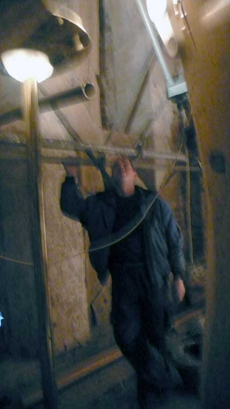 die Elektriker bauen am Licht hinauf und zum Glockengeläut