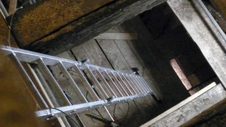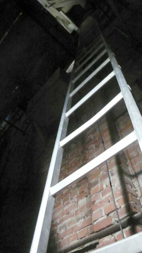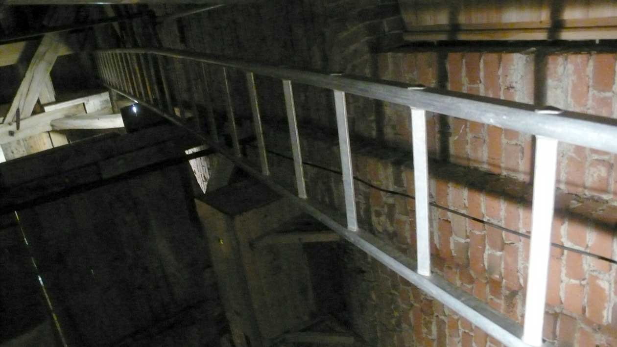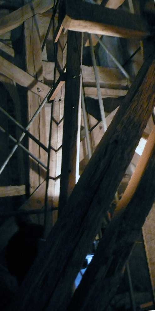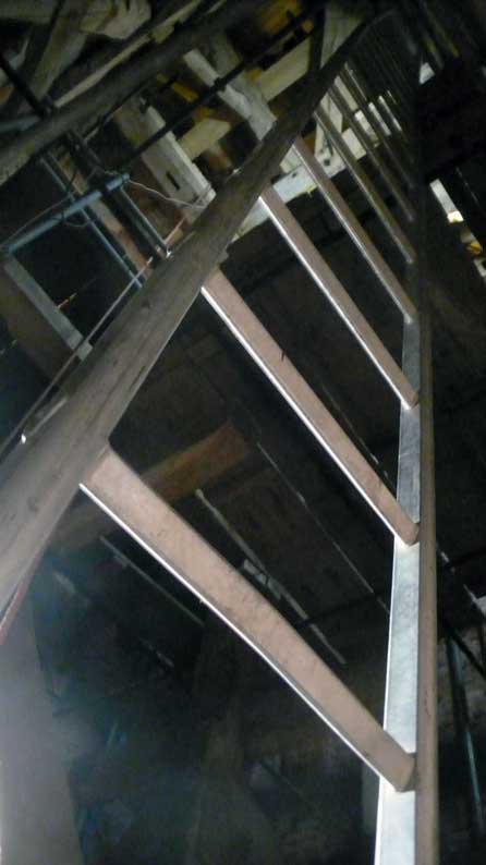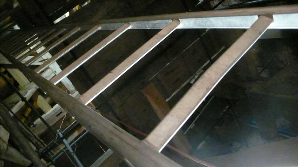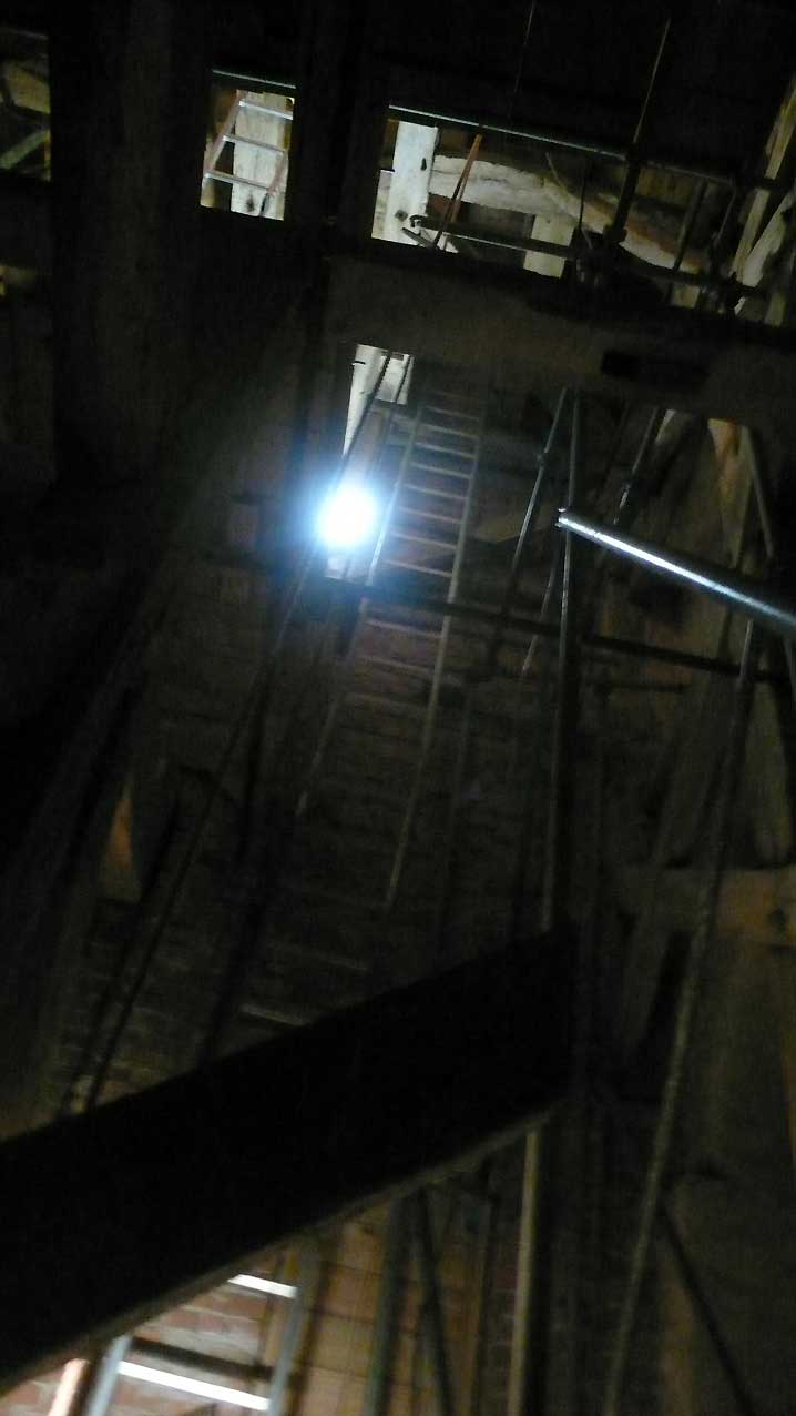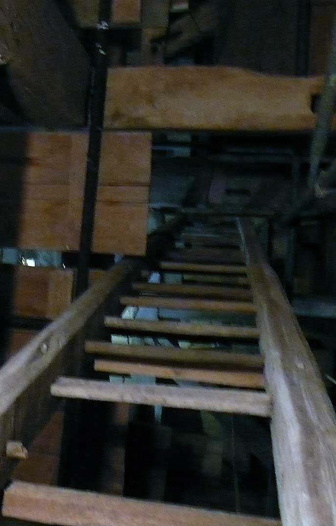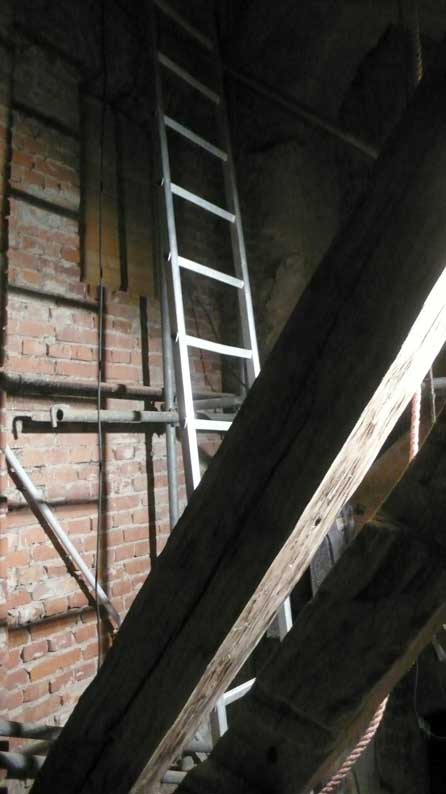 Sie war so alt wir der Turm selbst. Ich wollte sie, die immer noch diente, mit gesonderter Sorgfalt auf eigenen Kosten so wiederherstellen lassen, dass die geflickten Teile herausgenommen werden konnten, und dachte sie nach ihren treuen Diensten sie an die Seite zu stellen, im Turm selbst. M. der Erbauer der neuen Leiter schwor sie nicht anzurühren, als lachende Pläne zu iher Zerschneidung auftauchten. Nun zersägt liegt sie am Abend unten in der Kirche, wo jetzt oben Leitern aus Aluminum an Iher Stelle stehen bis die neuen Treppen schon in Arbeit kommen.