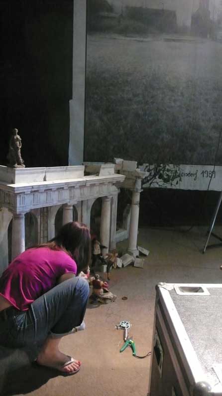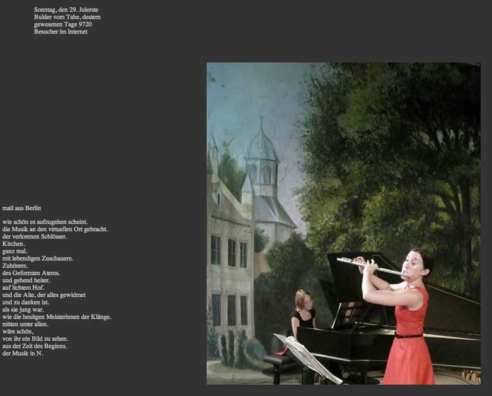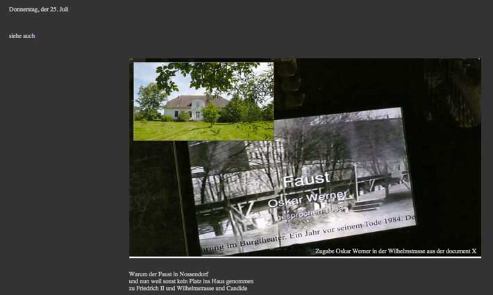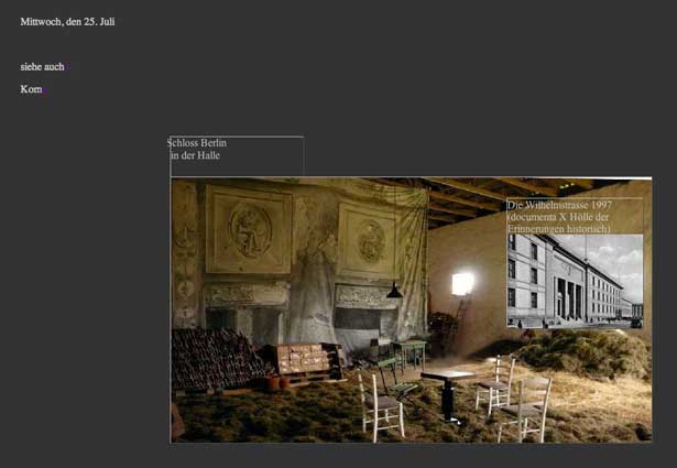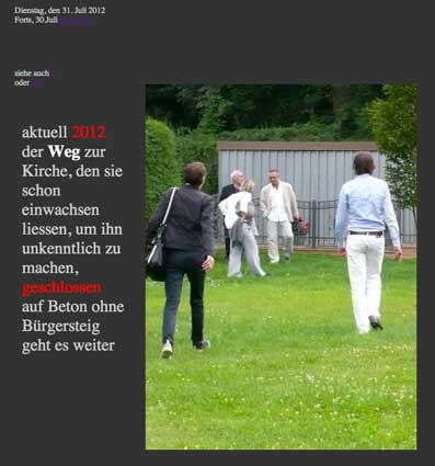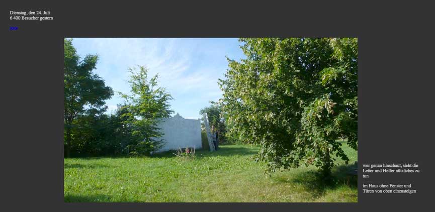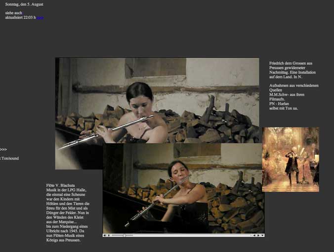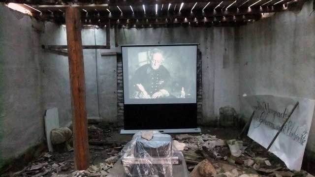 Wir sind gewohnt in dunklen Räume die Installatiuon unserer Filme und Dinge zu zeigen, hier wurde der Versuch gemacht im offenen Raum unter Bäumen die Besucher als Gäste zu begrüssen mit den Gehäusen der Musik und Bilder rundum, hindurchzugehen. Eine Installation von Leben und Geschichte, Und das am schwierigen Ort, der auf seine Weise mitmacht.