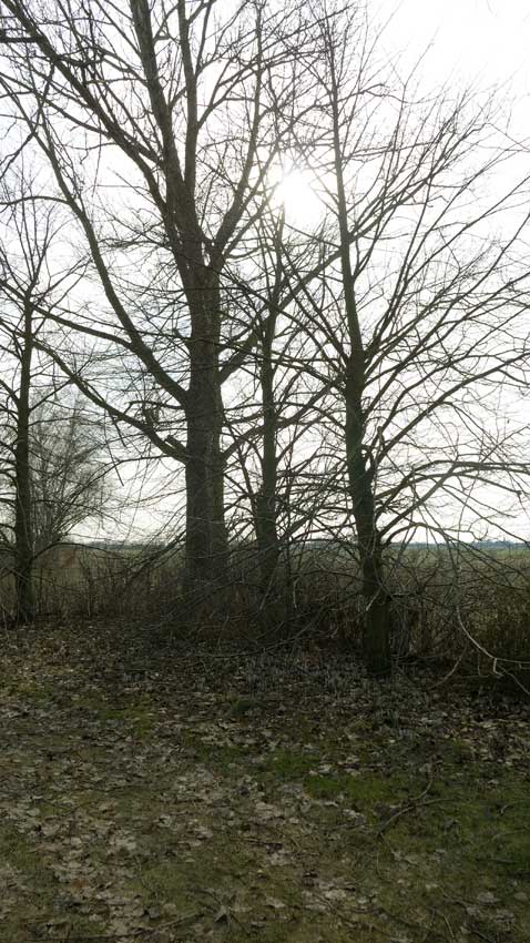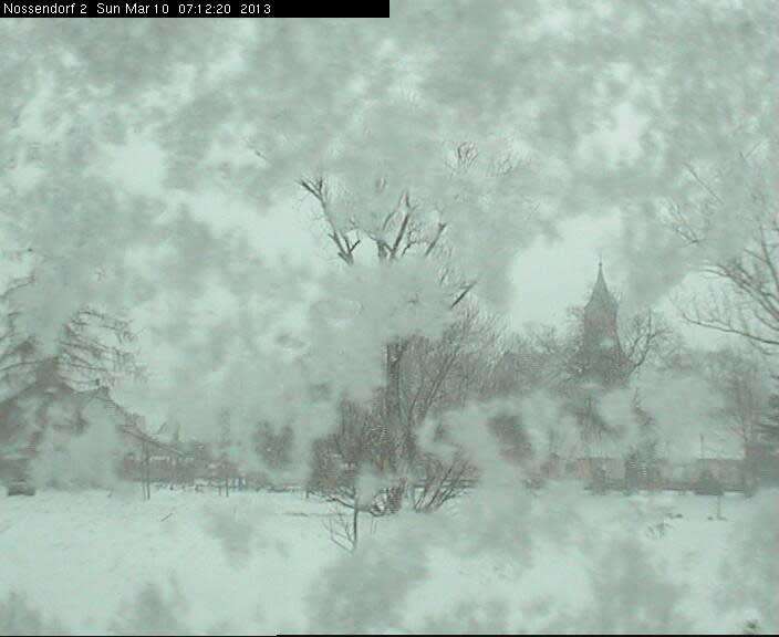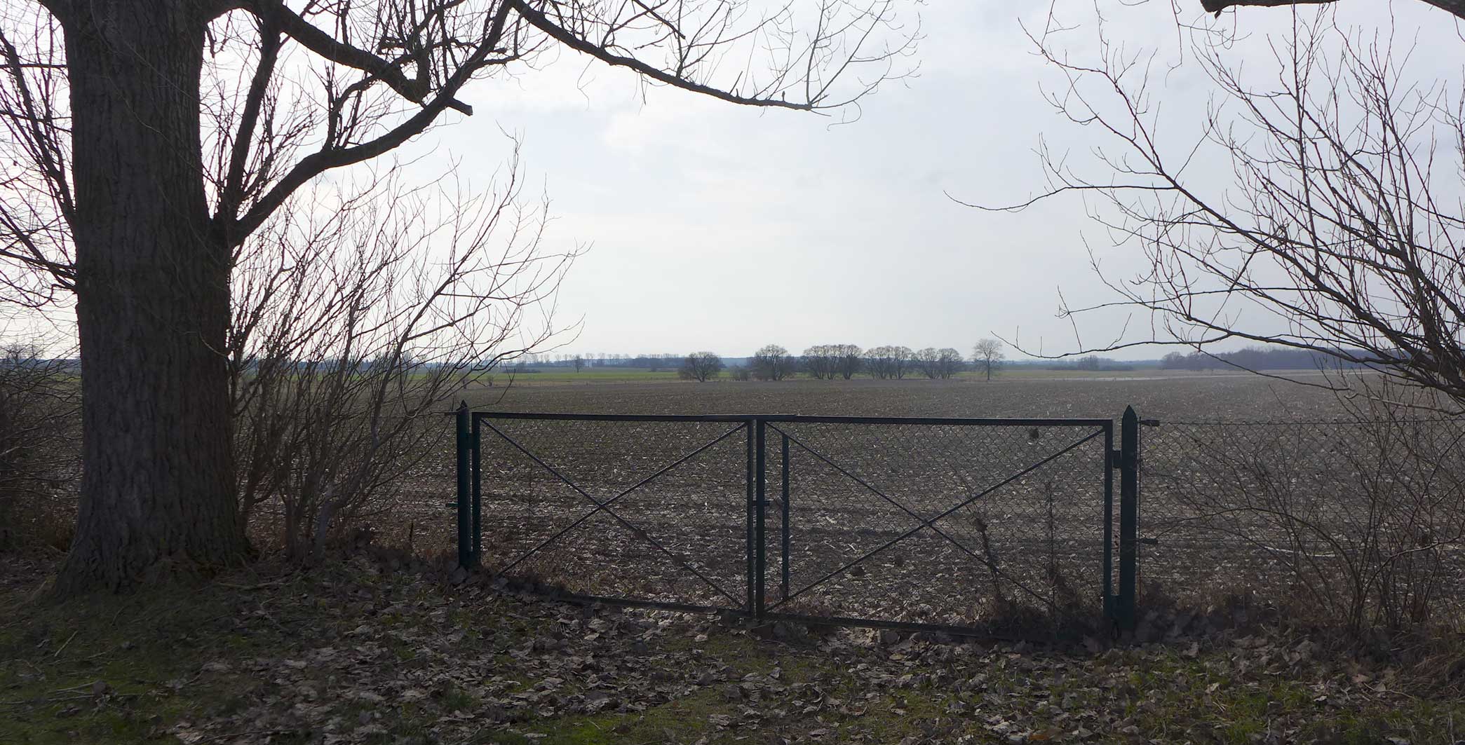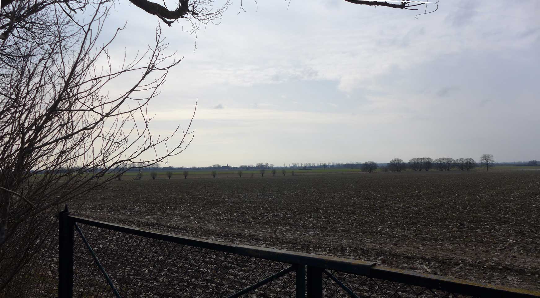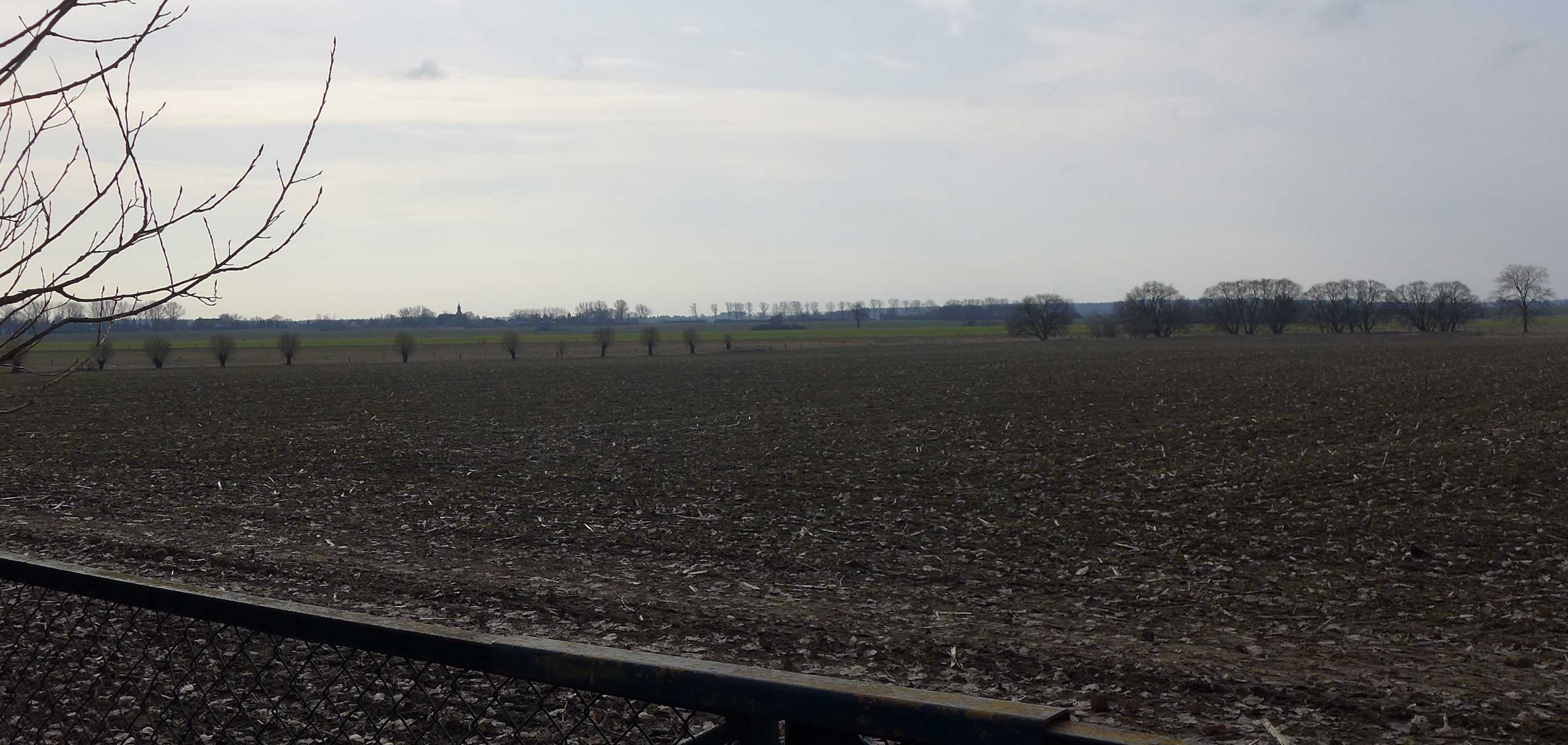 Nossendorf übers Feld von der nördlichen Seite. Der Turm sagt wo. Und was. Dazwischen die Weiden-Auen.