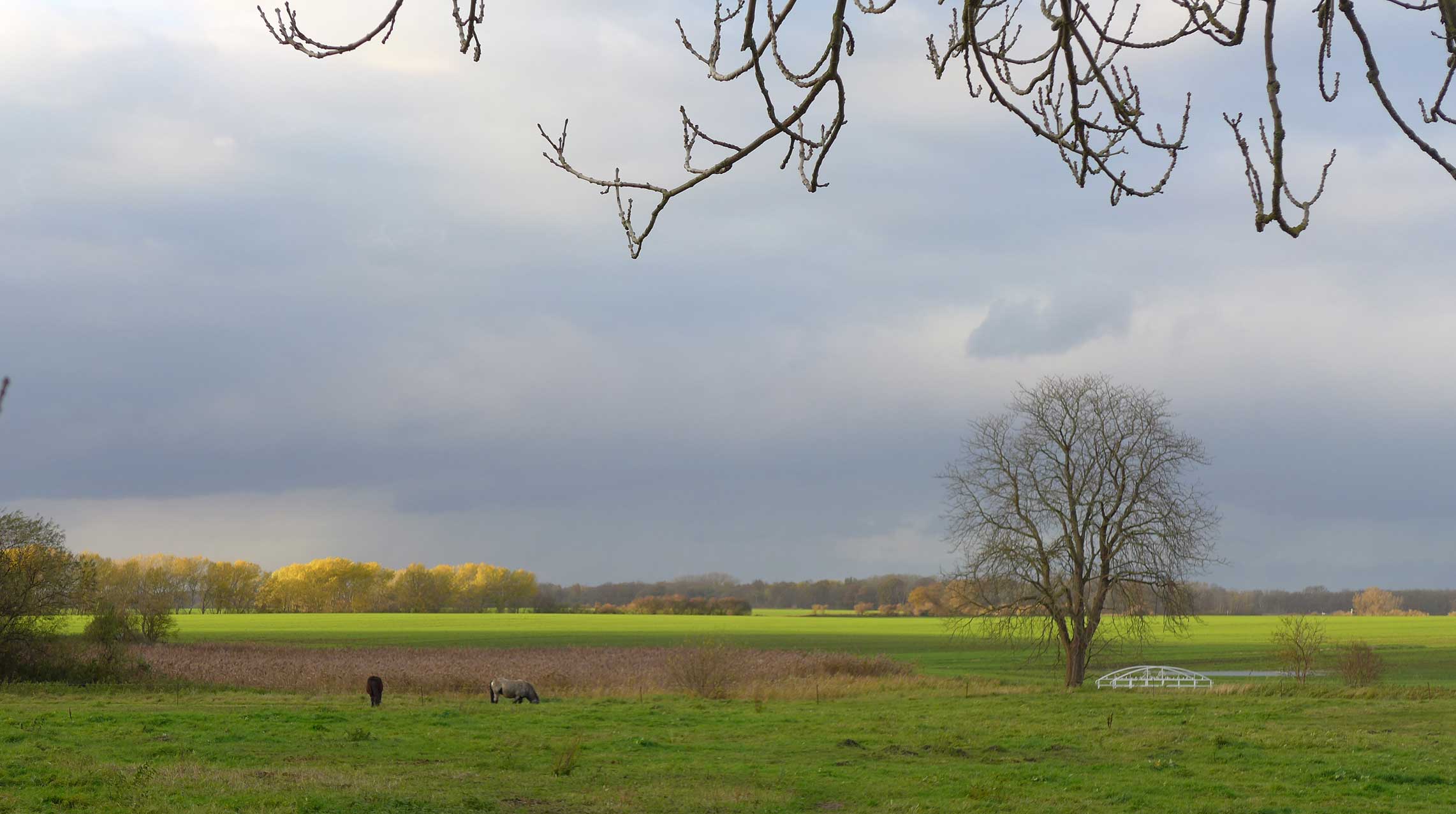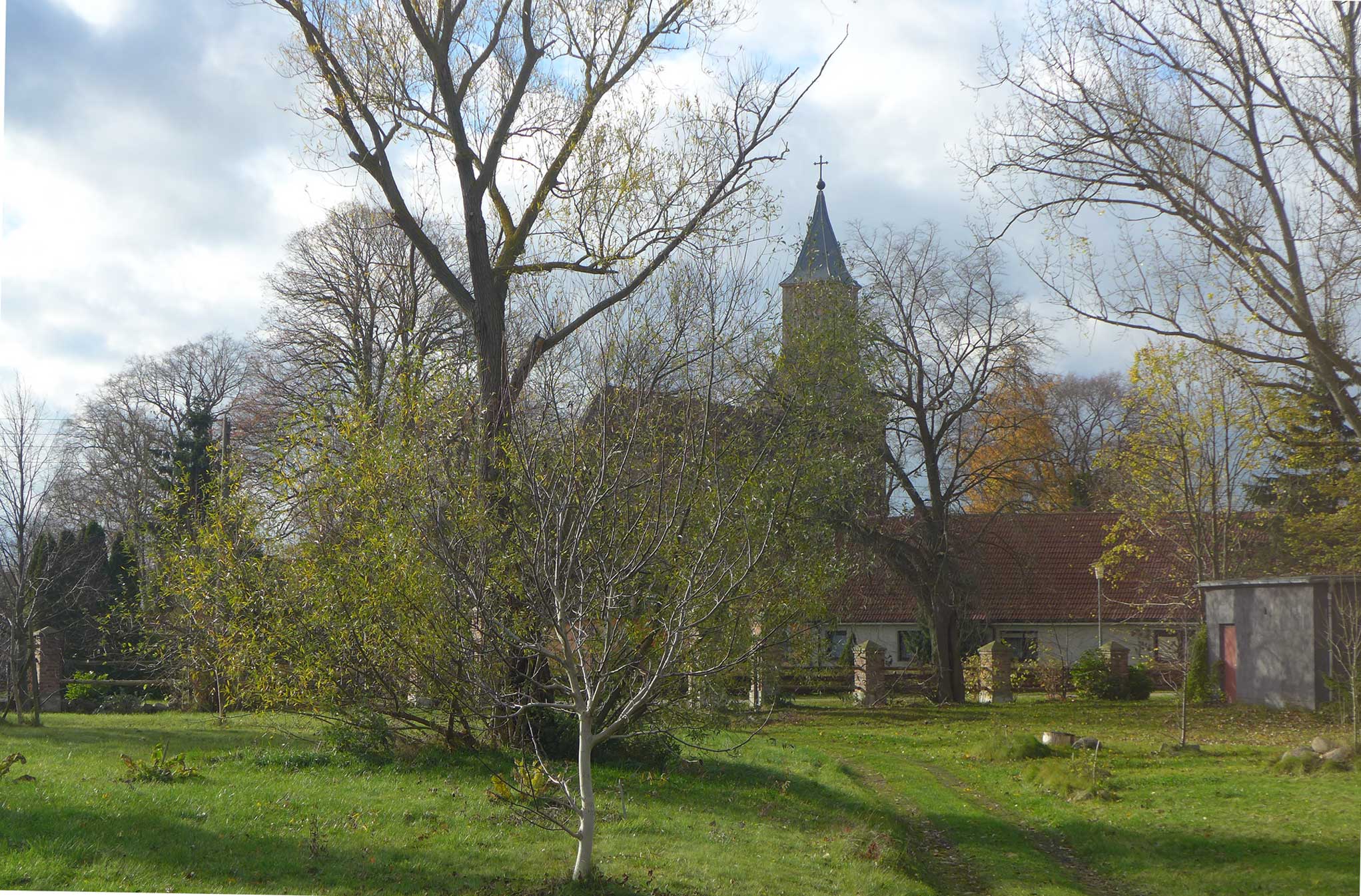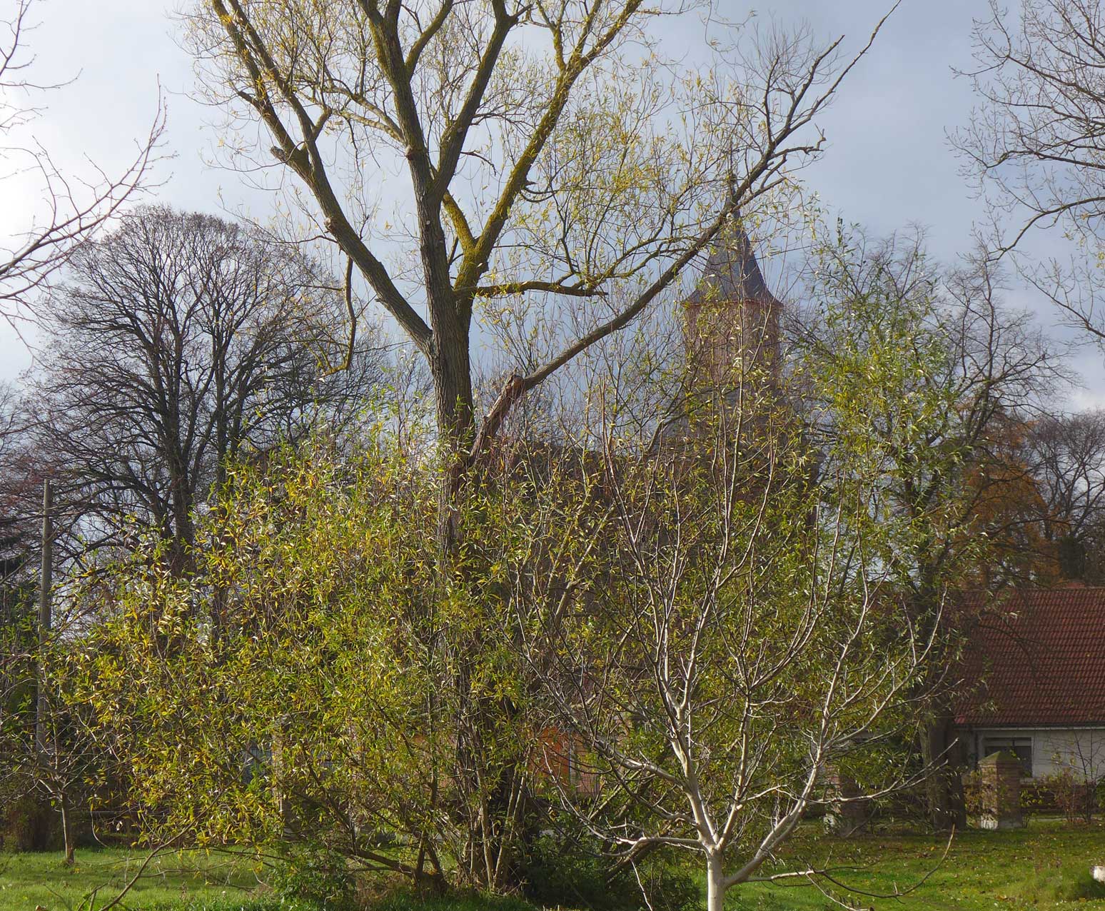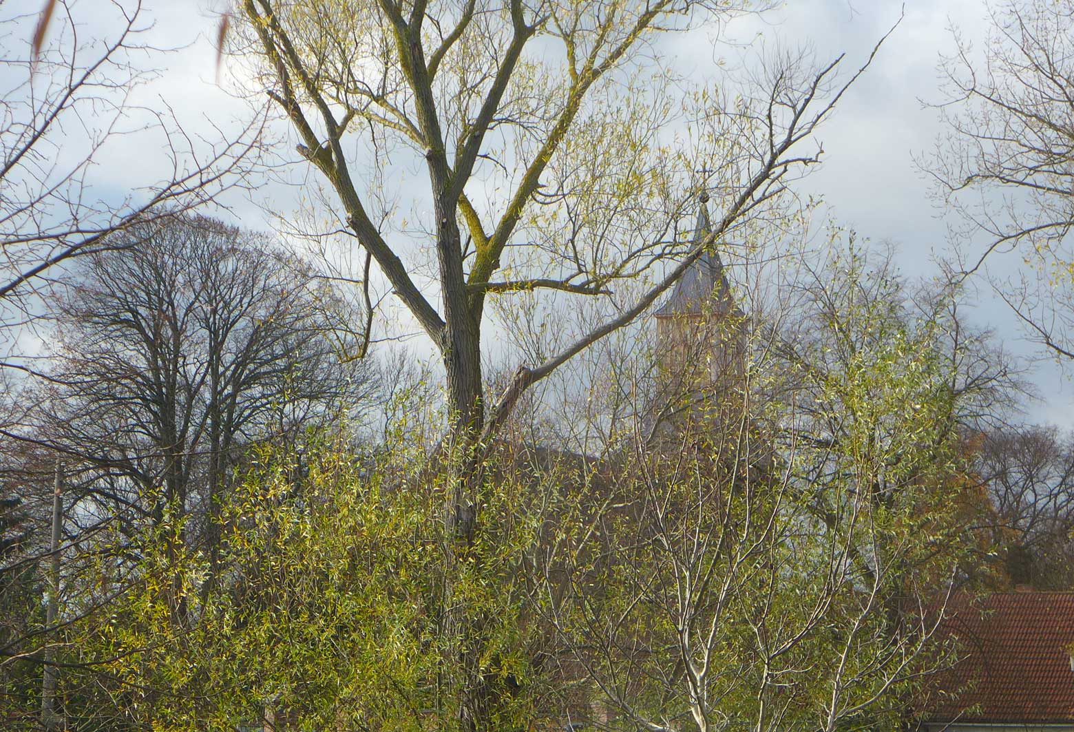 die Linden schon als Skelett der Äste und Zweige vor dem Winter, die Lärche noch im Gold des Herbstes über den Dächern und die Sommerlinde im lichten Grün vor dem Schnee.