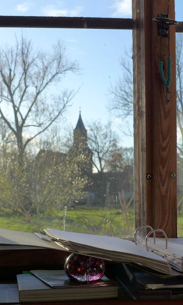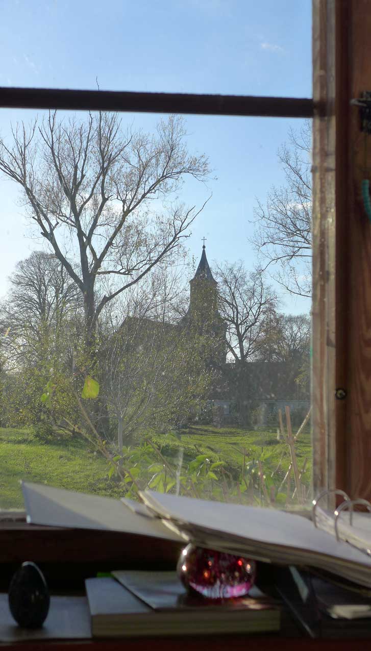 Der turm aber zwischen Sommer und Winter erscheint im Frühlings-Filigran der letzten Blätten aus dem Fenster zu sehen zum ersten Mal wieder Denn vor einem Jahr war er noch nicht da.