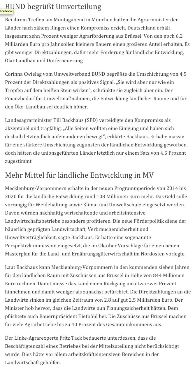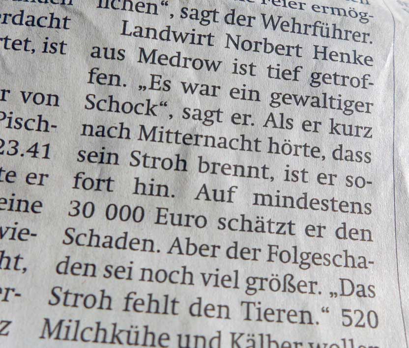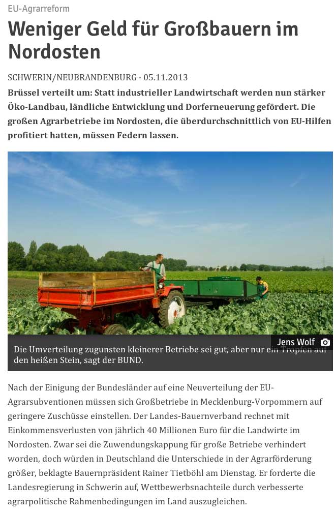 Im Nordkurir aus Demmin spricht R. Titeböhl als LandesBauernpräsident, gleich hier um die Ecke zuhaus. Und spricht von 10-15% weniger aus Brüssel und von Gefahr für die Arbeitsplätze, und weniger Geld für Inverstitionen, die zum Rationalisieren fehlen, als ob nicht weniger Maschinen, mehr Menschen in Arbeit bedeuten. Und dass gemeint ist: umdenken, anders wirtschaften. Ernähren, den Menschen und nicht die Bio-Öfen, der Subvention und Wege-Entsorgung. Wir sollten reden. Noch.