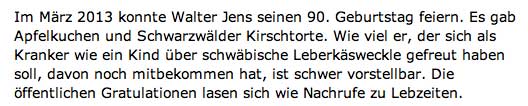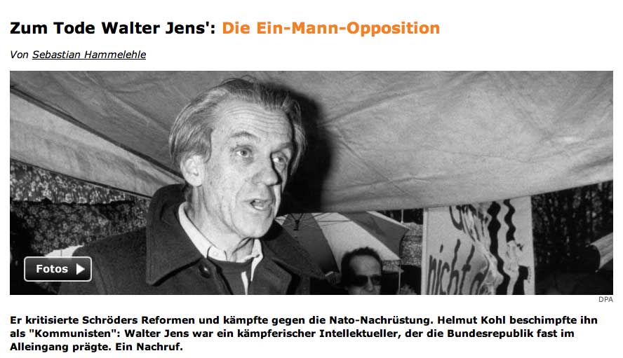 Eine Revolution und Widerstand im Westen anlässlich des Mauerfalls gegen die Dunkelmänner dieser Republik musste auch diesen meinen. Was als Flakhelfer, SS-Männer, Napola-Elite und junge PGs als junge Garde, damals dabei war, und sich dann als Sturmgeschütz der Republick vorstellte, würde immer dabei sein, gefährlich radikal, immer radikal und lautstark, werden für die, die nicht mitmachten. So wurden sie die Inquisitoren der Aufklärung vom Dienst. Sie sprachen mit der Inbrunst eines Goebbels und dem messianischen Anspruches eines Führers, mein Nachschein von Wort-Gewalt und Sprach-Macht und redeten von wehrhafter Demokratie. Diesem gab Gott eine Chance, als dieser bat nicht vor seiner Frau sterben zu wollen, indem jener seinen Geist schlug und ihn auf sie losgehen liess, dass sie in ihm nicht mehr den erkennen wollte, den sie einmal gewählt. Er wurde fromm wie die Lämmer, streichelte seinen Hasen und büsste die Messer-Schärfe seiner Reden mit der Sanftmut des Irren. Gott war seiner gnädig. Wogegen er sich zeitlebens mit der Blindheit des Vielredners gewehrt hatte, von da kam nun die Rettung aus seinem Hochmut. Er musste in der Einsamkeit des Stillen jenseits selbst der Einfalt des Nichts dienen und sonst nichts bis er nun in groteskem Getöse der alten Mittäter und letzten Schüler dahingeht.