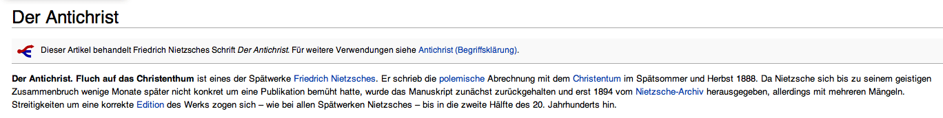 als Nietzsche zuletzt seinen Text schrieb, den er Antchrist nannte, lebte er in einer vom Christentum bestimmten Welt. Man kann sich vorstellen was das hiess.