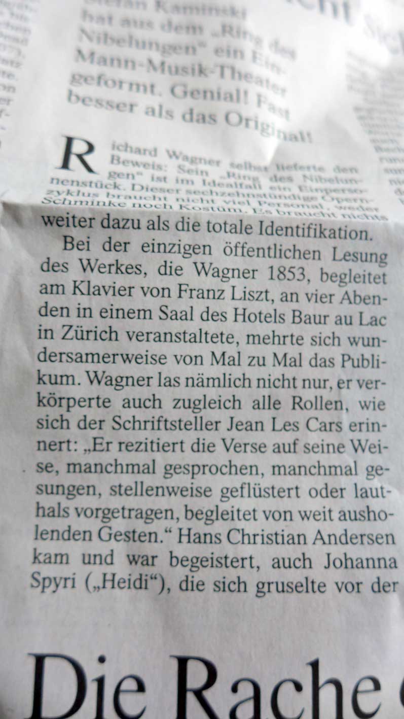 Die solistische Vorführung des Ring anstelle der Bühne mit Orchester und Sängern - das erinnert an die monologiche Lesung von Kleists Penthesilea vor dem Autor, hier aber mit ihm, der ein Kmponist war. König Ludwig hat die Realisierung möglich gemacht. Anfangs auch ohne und gegen Wagner selbst (Rheingoldpremiere in München1865), aber doch immer Wagner s Musik, wie denn sonst Wagner.