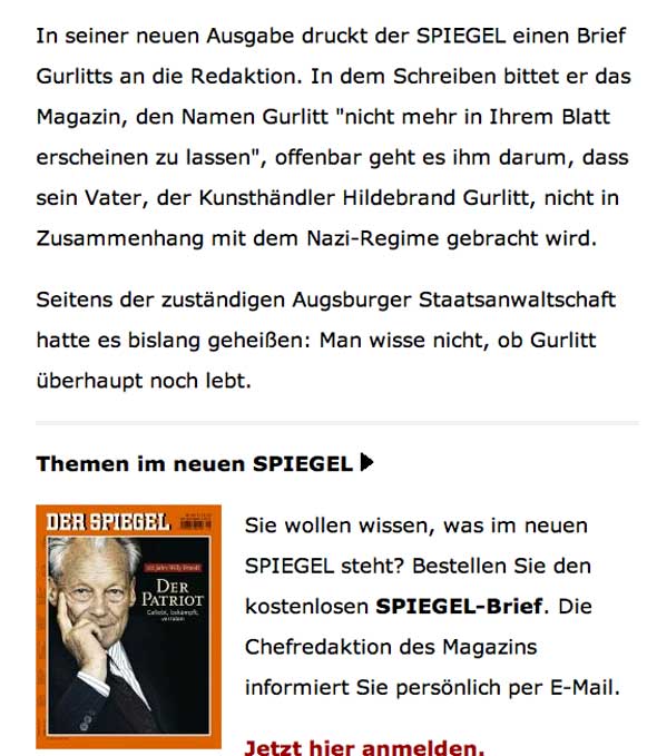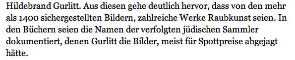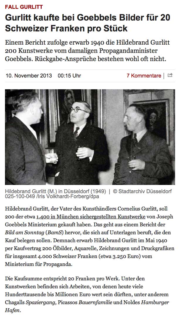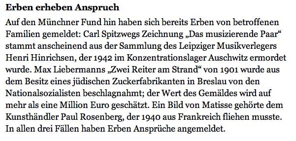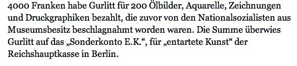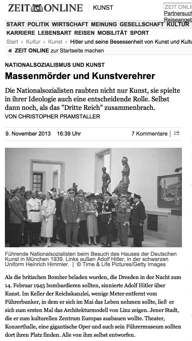 Jetzt kommen sie drauf, dass das hitlersche System spezielll in Sachen Kunst durch eigene Positionen zu definieren und fassen sei. wenn aber Kunst, die gewollte und die ungewollte, verfolgte, ein Schlüssel sind von allen anderen Dingen, dann bewegen wir uns im Zentrum dessen, um was es geht, was uns interssiert und was zu tun war und ist. Das sie zur Eigentumsfrage nun machen und also Geschäft.Es darf einfach nicht wahr sein, dass wir nach alle dem nichts anderes gelernt hätten.