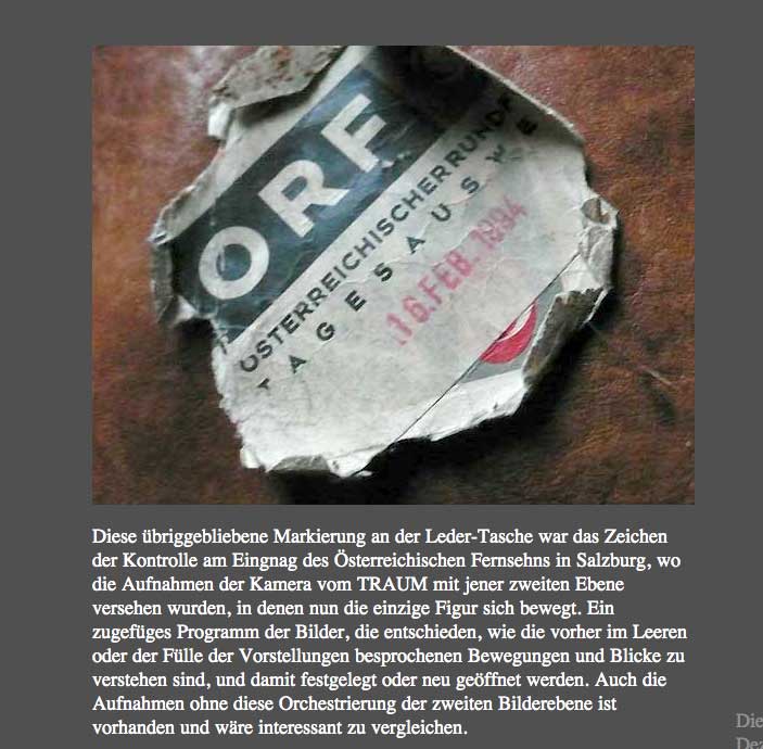 Die grösste Tat aber war, den Traum, was sonst als Film gerettet zu haben, in Salzburg, nach dem Nein überall in Deutschland und eigentlich schon verloren. In Salzburg aufgenommen im Kino der Bühne, vom österreichischen Fernsehen als Film nun Nossendorf zu ehren. Das damals noch schlief.