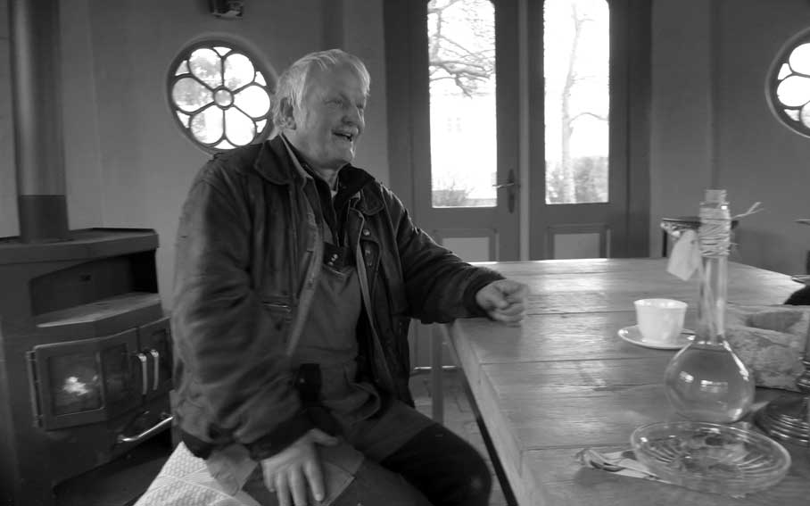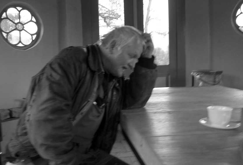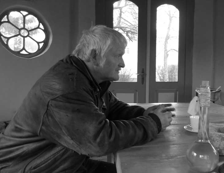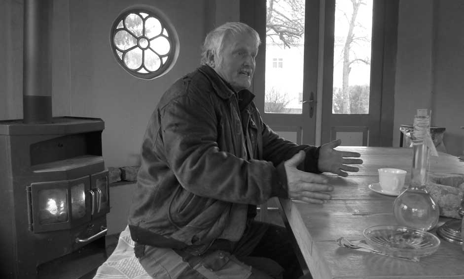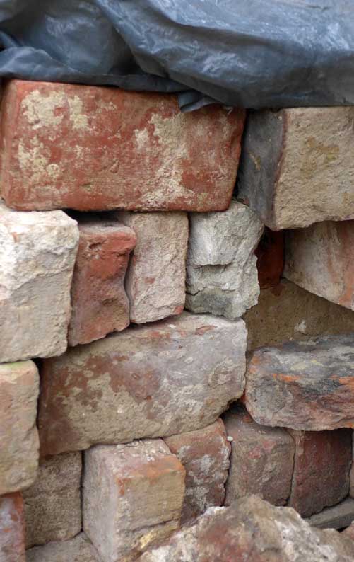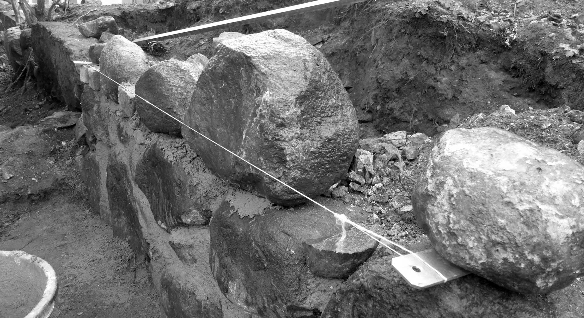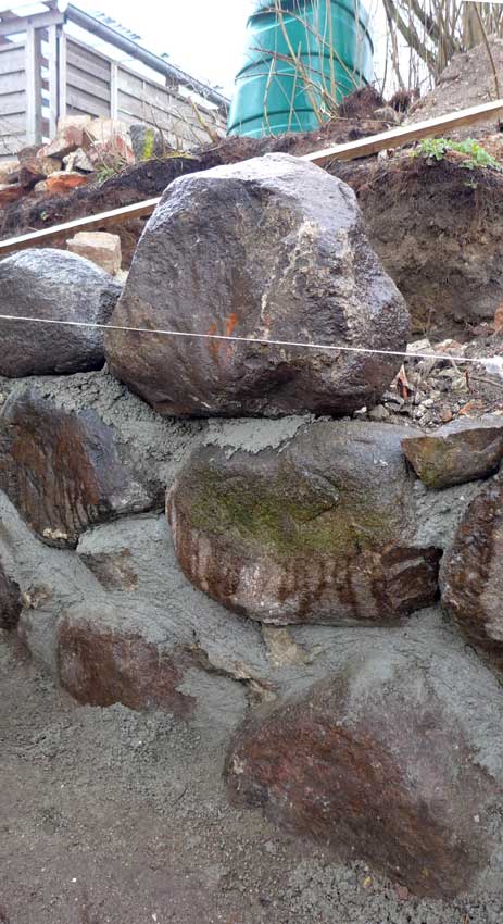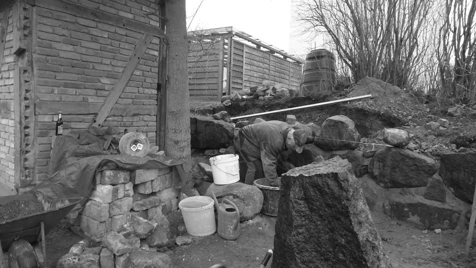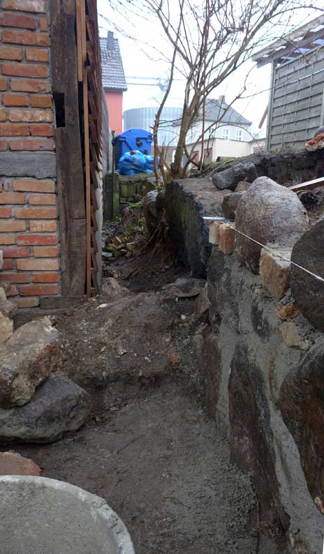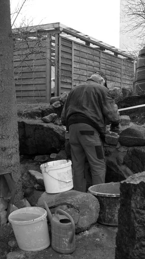 Günter baut an der ehemaligen Mauer der Heilig Geistkirche mit den alten Steinen direkt am originalen Platz.