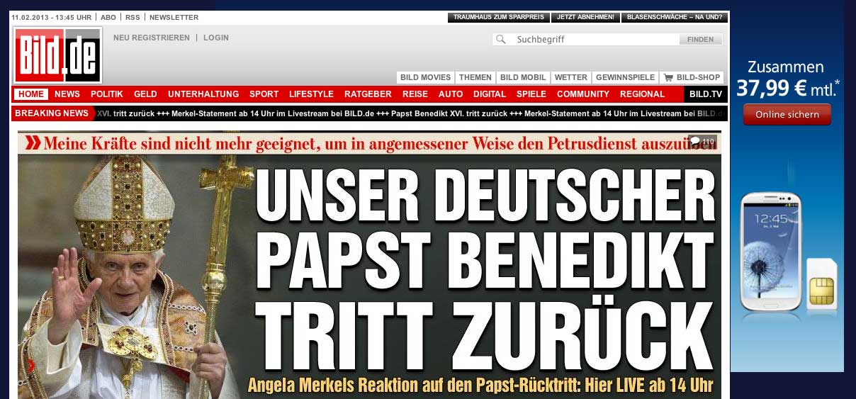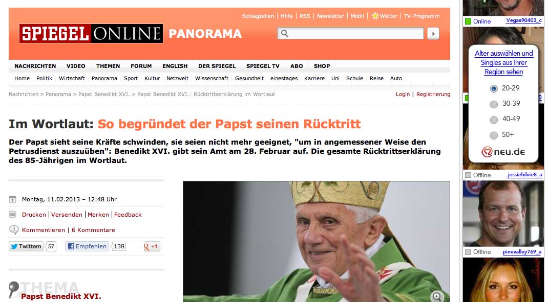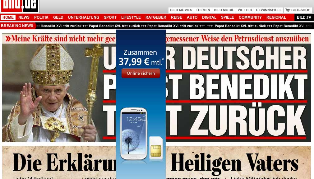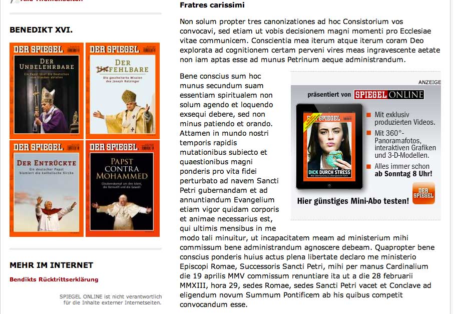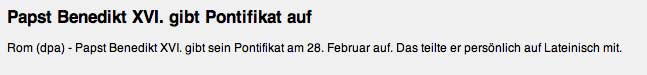 Im Bewusstsein des Ernstes dieses Aktes erkläre ich daher mit voller Freiheit, auf das Amt des Bischofs von Rom, des Nachfolgers Petri, das mir durch die Hand der Kardinäle am 19. April 2005 anvertraut wurde, zu verzichten, so dass ab dem 28. Februar 2013, um 20.00 Uhr, der Bischofssitz von Rom, der Stuhl des heiligen Petrus, vakant sein wird und von denen, in deren Zuständigkeit es fällt, das Konklave zur Wahl des neuen Papstes zusammengerufen werden muss.