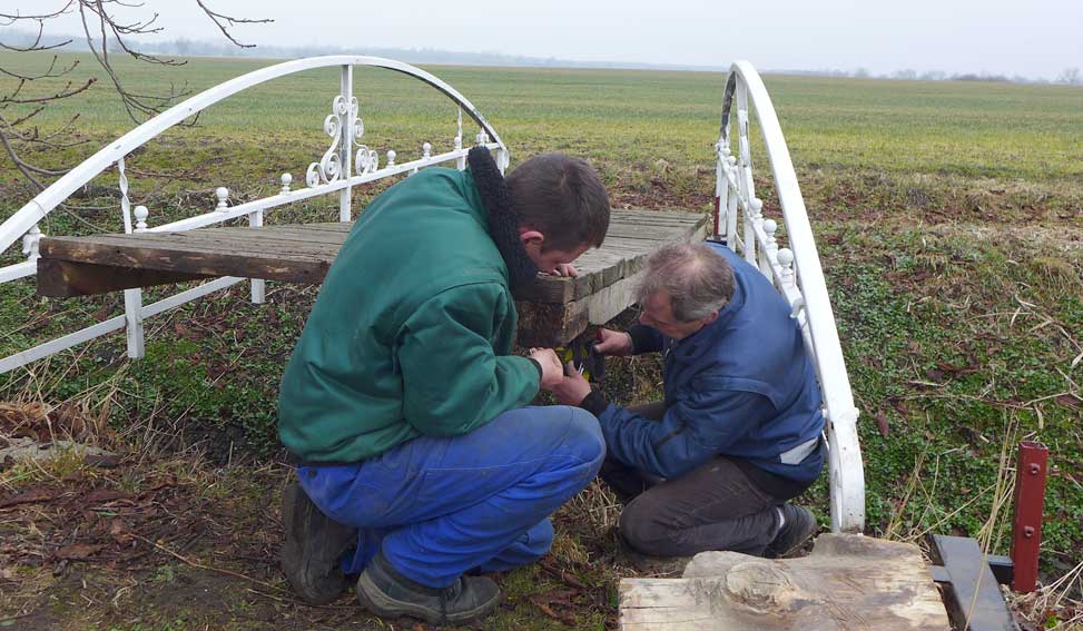 Einen Tag nach dem Turmbau aufs das Feld gehend vom Weg den Turm zu sehen, sahen wir den Weg untergepflügt. Seitdem sehen wir vom Turm, wann der Weg wieder hergestellt sein wird. 180 Unterschriften des Dorfs sehen mit.