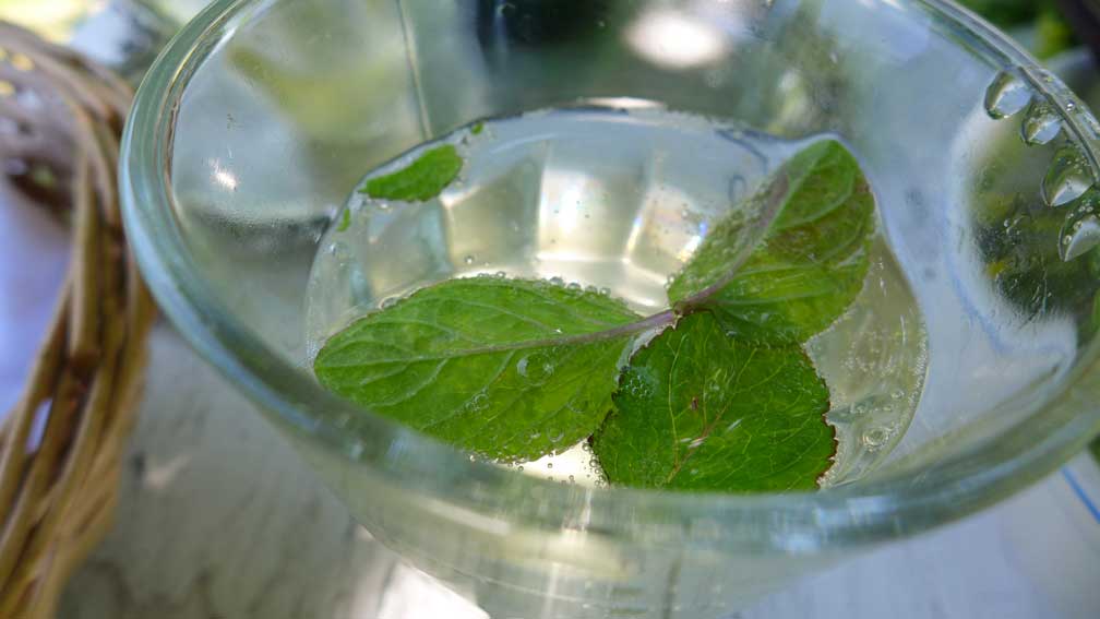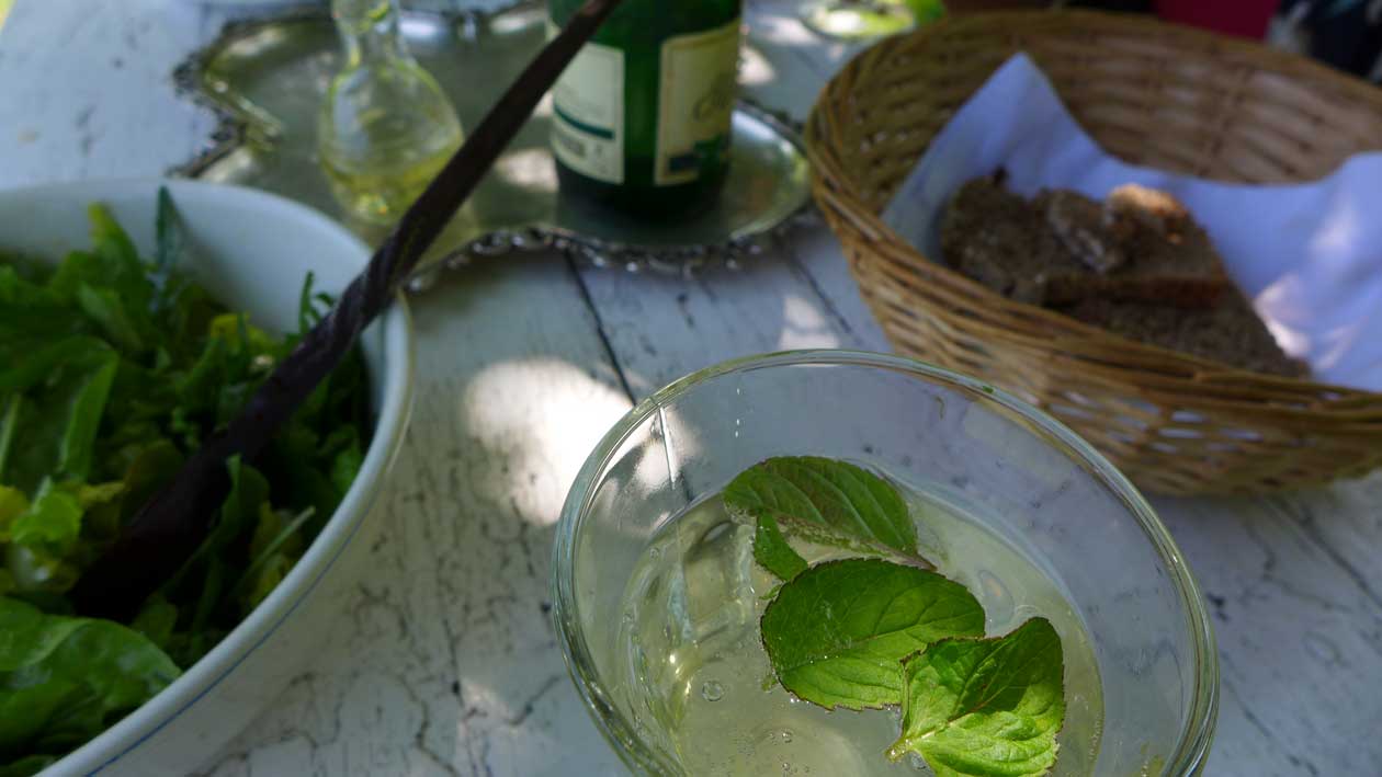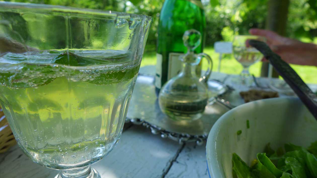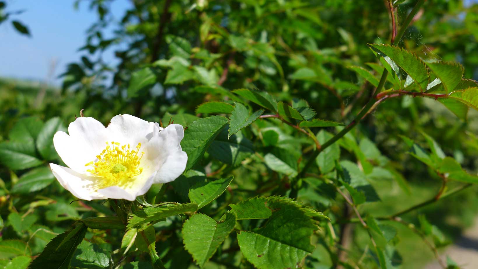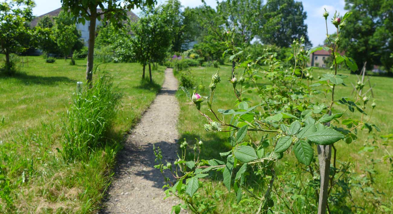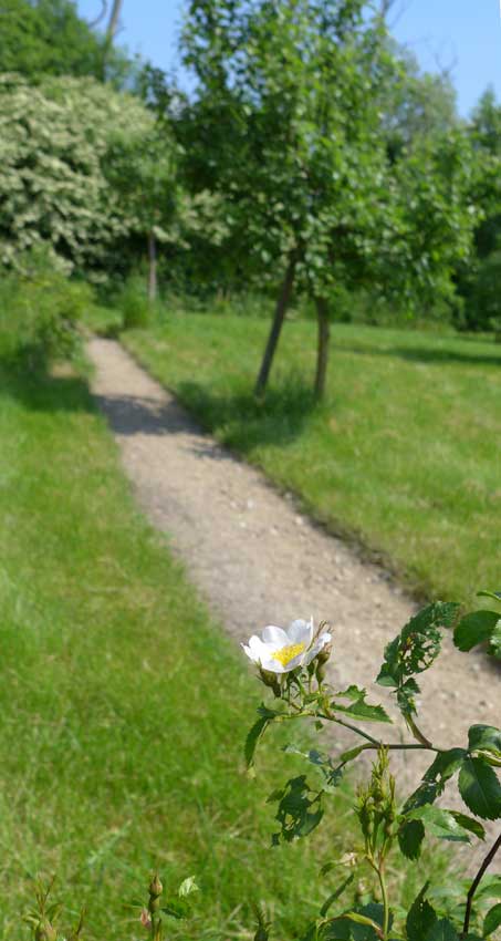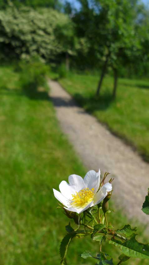 vorbei an Rosen, die in Knospen stehen und Esskastaniene, die blühen