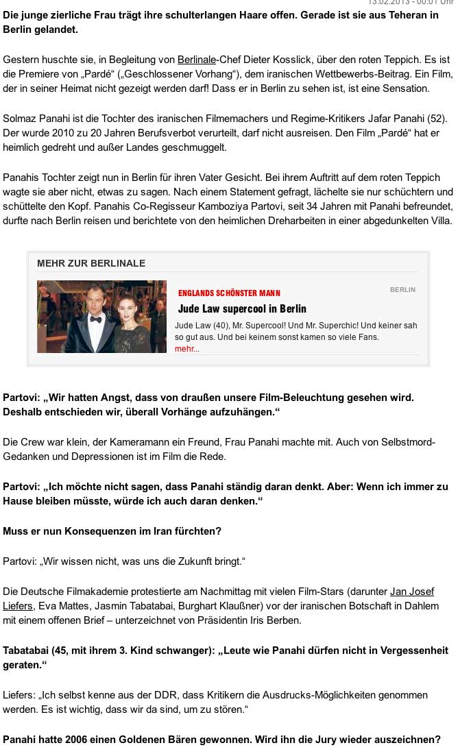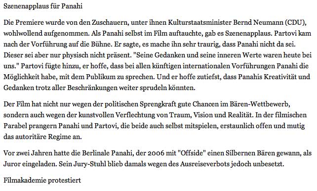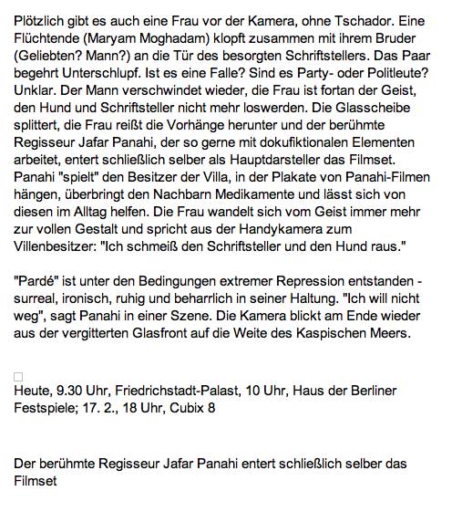 Im Haus, mit welchen technischen Mitteln, wie kriegt er es raus wohin, was. Einmal sieht man in einem Ausschnitt ihn mir einen Bildtelefon das Gesicht einer Frau erscheinen lassen. Ein Hund spielt eine grosse Rolle, in Iran verachtet. Der Regisseur tritt selber auf.. Nun ist der Film in Berlin, in den Festspielen. Wars das?