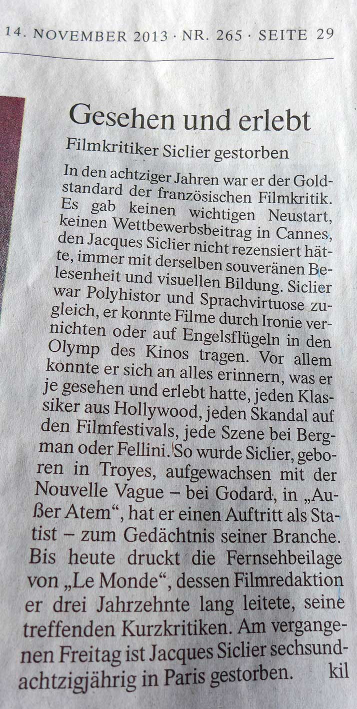 Danach in einem Bogen entstand jener Hitler als Film solcher Art? und die Monologe des Traums? Ob sie da noch alle folgen konnten. Es war zu wagen, immer mehr und neu und in Paris gabs nur, nur in Paris die Nacht auf der Bühne, 5 Stunden in deutscher Sprache von einer Frau. Und die Musik war Bach mit nur einem Cello.Welttheater eines Solitärs, wie er schrieb. Siclier hatte es geahnt, da kommt noch was, und war dann sicher längst nicht mehr dabei. Aber die Fackel brannte, von ihm entzündet. Und heute...