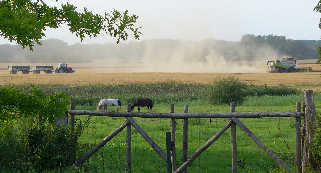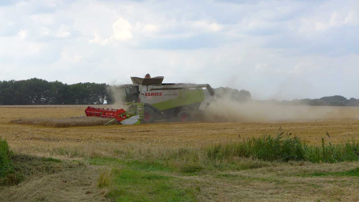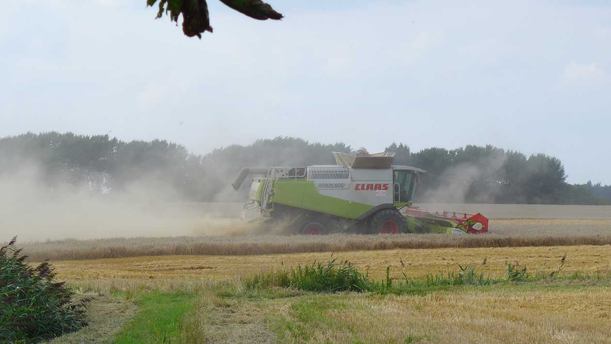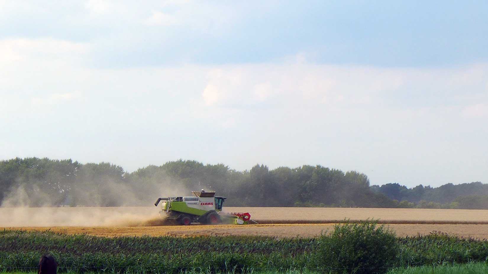 staubend zermahlt die grosse Maschine der Ernte segen. Da bleibt kein Stroh für die Tiere und das Korn ist mager.