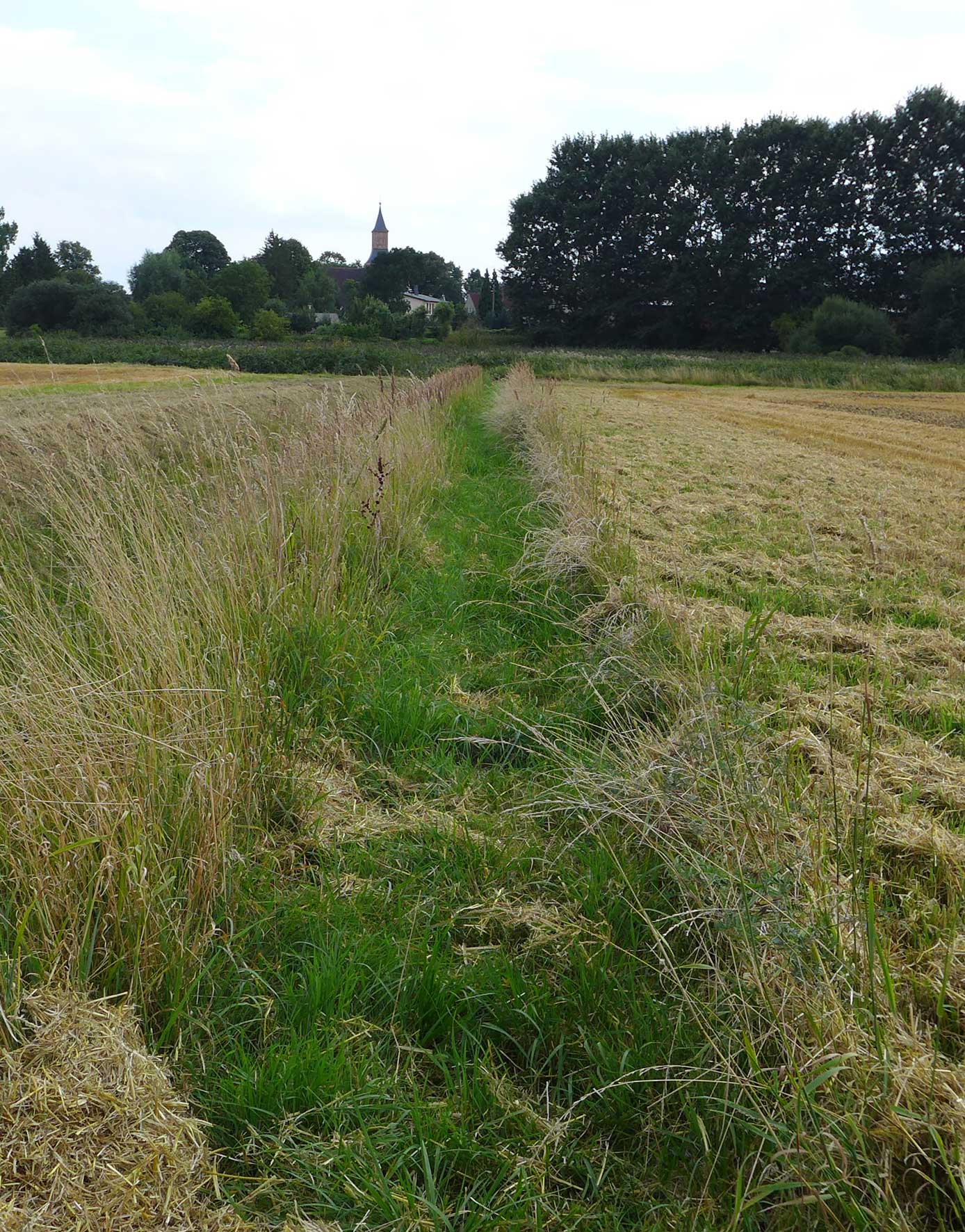 Den Weg durch die Felder behauptend, weist der Turm wo es lang geht.