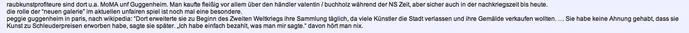 Das hilflose, auf Zuruf reagierende und keineswegs gesetzeskonforme Vorgehen deutscher Behšrden zeigt, wie fragil der Boden ist, auf dem wir uns fast siebzig Jahre nach Kriegsende bewegen. Raubkunst gibt es nicht nur in Museen, sondern in gro§en Privatsammlungen, zu denen man sich Zutritt verschaffen mŸsste. Wie? Und was ist mit anderen enteigneten GŸtern au§er Kunst? Wohldurchdachte GesetzesŠnderung tut not. Abgesehen davon, dass Deutschland kein mit …sterreich vergleichbares Restitutionsgesetz hat, das Museen zur RŸckgabe zwingt: Eine rasch zurechtgezimmerte Lex Gurlitt wŸrde nur Ungerechtigkeit mit Ungerechtigkeit bekŠmpfen. ( DER STANDARD, 2013)