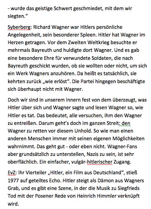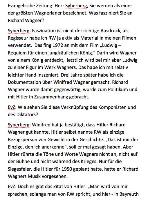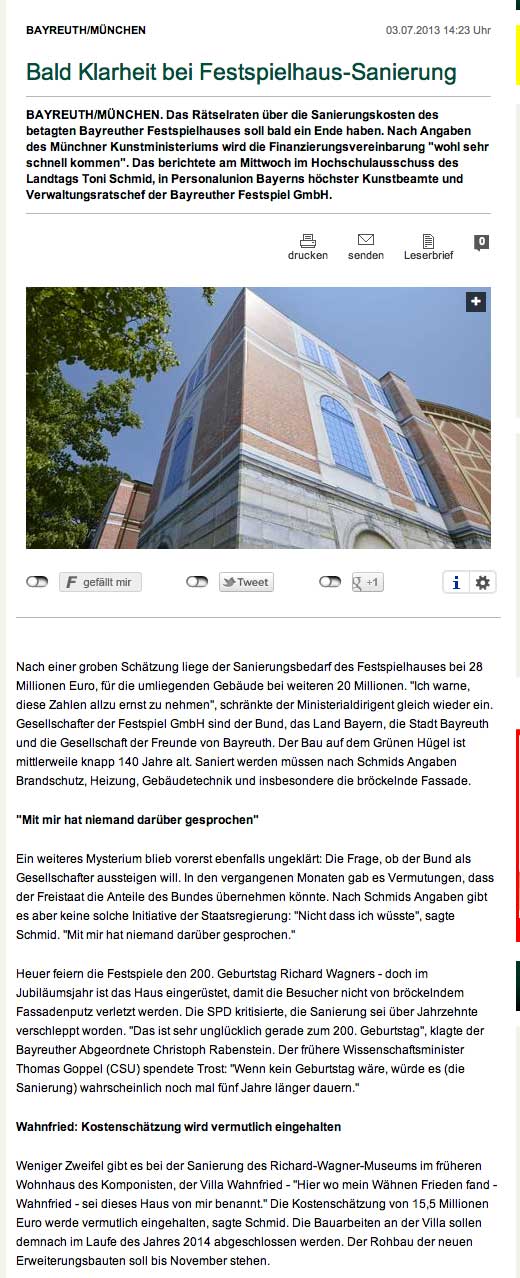 Ihr Gastbeitrag zum Aspekt „Missbrauchter Erlösungs-Mythos – Sind Wagner-Fans Nazis?“ umfasst ca. 3000 Zeichen (etwa eineinhalb DinA4-Seiten) und sollte mir bis Montag, 15. Juli, per Mail vorliegen. Auch ein Porträtfoto von Ihnen wäre hilfreich.